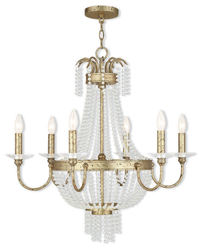 A beautiful cascade of clear crystal beads creates a striking effect of refracted light. This six light chandelier is finished in a hand appled winter gold finish mixing traditional refinement with modern style. Place this crystal chandelier in both contemporary and time-honored spaces for the perfect look