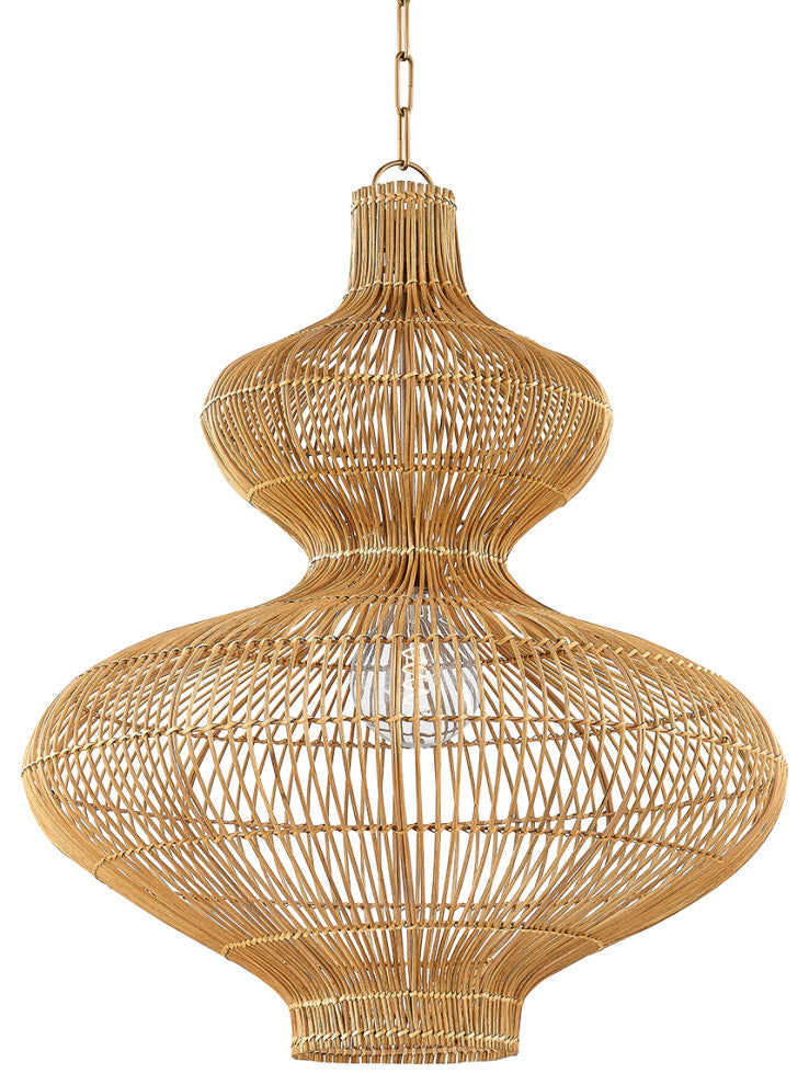 Embodying a sense of refuge, warmth, and reprieve, the Irvine pendant recalls a traditional Vietnamese hanging lantern with a modern, sculptural twist. Featuring two tiers of rounded shapes that cinch in the center, the balanced silhouette appears to gently undulate overhead. The loose rattan weave allows light to sift through, casting a warm and inviting glow throughout a space. Suspended from a bronze chain, Irvine creates an elevated lighting experience. Part of our Chandler McLellan collection.