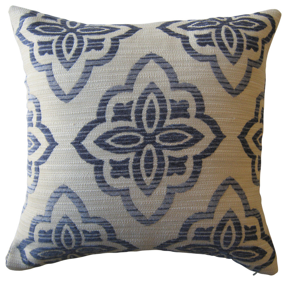 Bold geometric patterns are a hot design trend right now. Update your room with this chenille texture blue and ivory pillow. Pillow is 18" x 18"All of our pillows are handcrafted in our studio with the most careful attention to detail:-Fabric edges are serged-Invisible zipper closure at the bottom-Motif centered on front side, solid fabric on back.-Pillow Cover OnlyDry Clean Only.