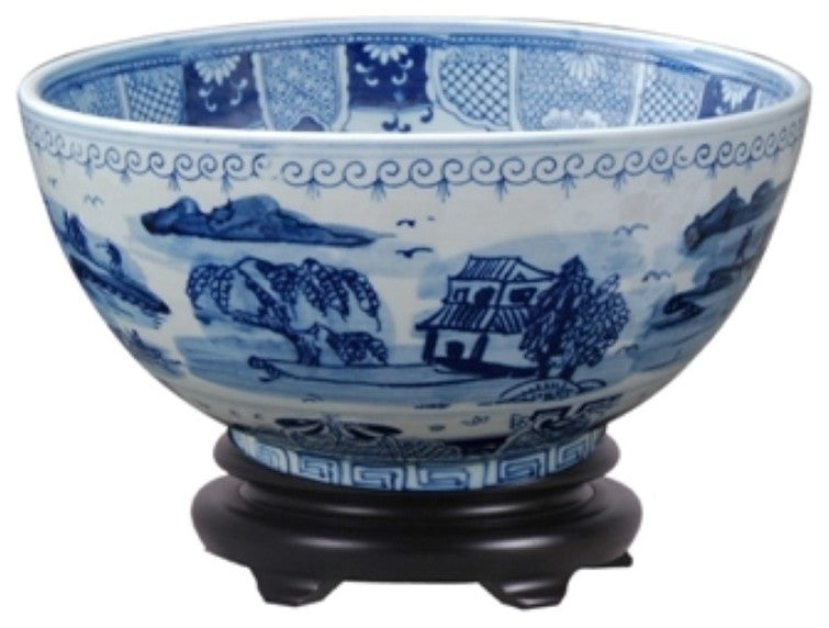 Chinese Blue and White Blue Willow Porcelain Bowl With Base 12"