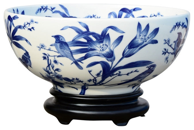 Please note : As most of our porcelain pieces are hand made and hand painted they may be slightly different from the photo in both shape and the way it is even colored! We do our best to find the one that is most common but sometimes they will be slightly different. Chinese Blue and White Floral Bird Pattern Porcelain Bowl w Base 14" Diameter Country of Origin: China Dimensions : 14" Diameter