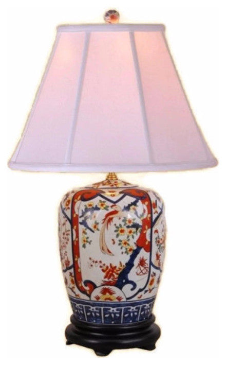We are committed to providing high quality and affordable products with exceptional customer services. Our consistent efforts in Research and Development will provide a solid foundation to produce more high quality new products for our customers for many years to come. Bulb Type: 1 WAY SOCKET (High and Low Switch) Wattage: 100 Number of Bulbs: 1 UL LISTED: YES Bulbs Not Included Comes with Shade and Finial We are Asian Style Furnishing and we are here to help you add beautiful Asian colors and history to your home. We speciallize in porcelain items as well as creating fantastic lighting with our pieces. All of our items are for decorative use only not good for food storage. All of our items are for decorative use only not good for food storage. We have been in business for over 30 years and I am the second generation to be in this business. I am excited to bring my energy and family experience to those in need of some Eastern influences in their home. Please note : As most of our porcelain pieces are hand made and hand painted they may be slightly different from the photo in both shape and the way it is even colored! We do our best to find the one that is most common but sometimes they will be slightly different. Chinese Porcelain Round Vase Floral Imari Motif Table Lamp 25.5" Country of Origin: China Dimensions (in inches): Height: 25.5" Length: 16" With shade