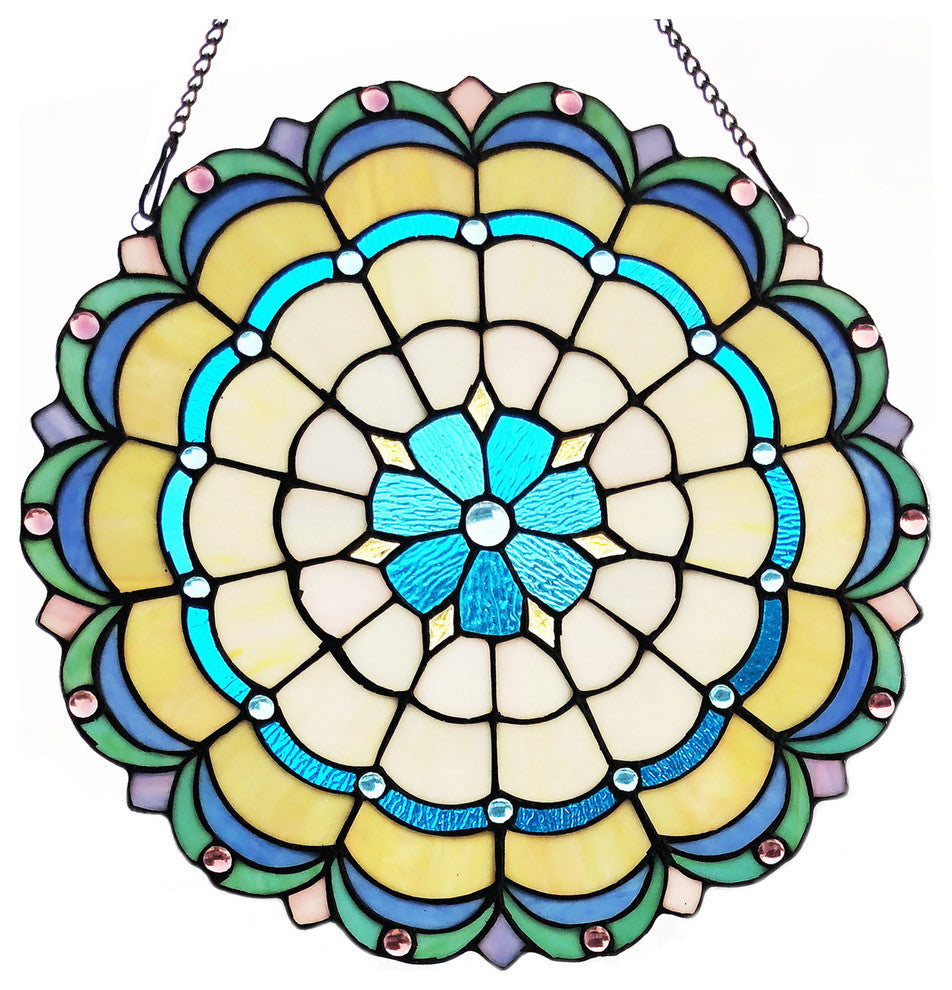 DAKOTA, a Victorian style stained glass window panel features a beautiful hand crafted design that will be sure to catch your eye! Hand crafted from over 165 pieces of art glass and 37 glass beads. Main colors are blue and yellow. Handcrafted using the same techniques that were developed by Louis Comfort Tiffany in the early 1900s, this beautiful Tiffany-style piece contains hand-cut pieces of stained glass, each wrapped in fine copper foil.27.5" Hanging Chain (included)169 pieces glass cut, 37 glass beadsIndoor Setting