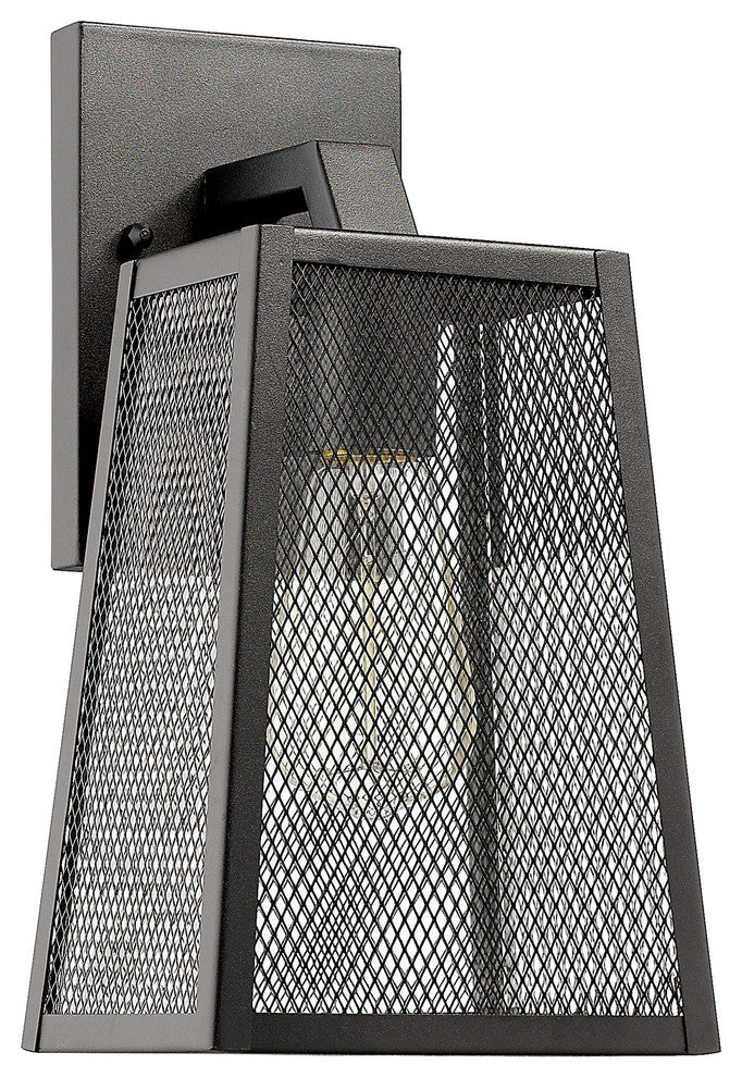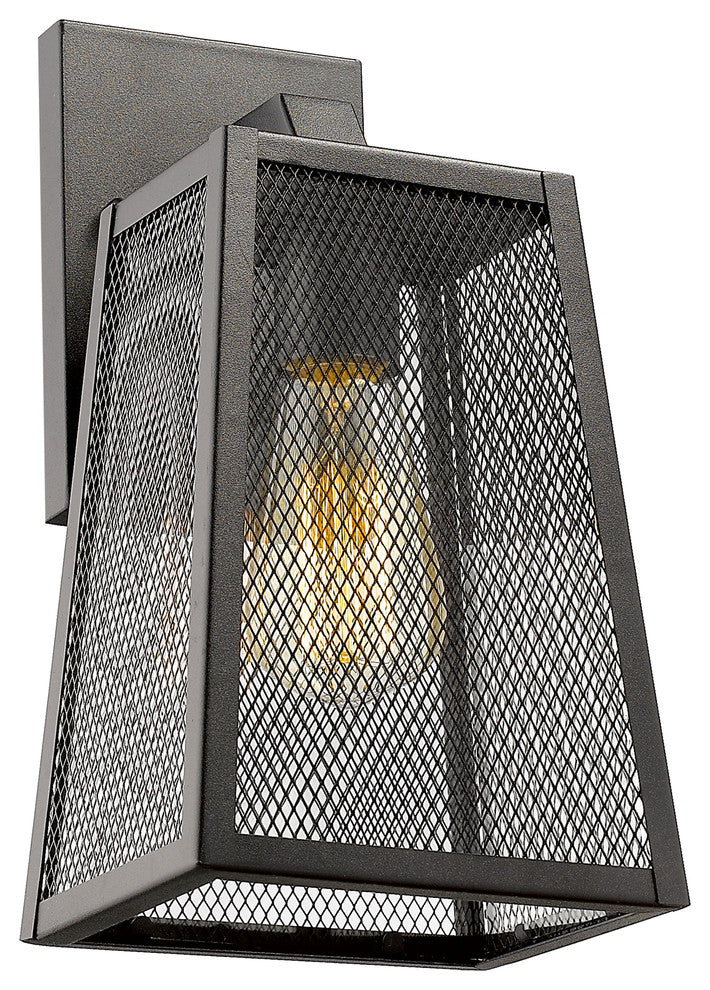 EMERSON, an Industrial style 1 light outdoor wall sconce features a textured black finish with steel mesh walls. The clean lines of the steel frame adds interest while the cage provides ample light to your outdoor decor.