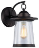 This 1-light outdoor wall sconce features a oil rubbed bronze finish that will complement many transitional decors. The clear seedy glass shade allows the light to bounce in different ways and creates a warm welcoming glow to the outside of your home.