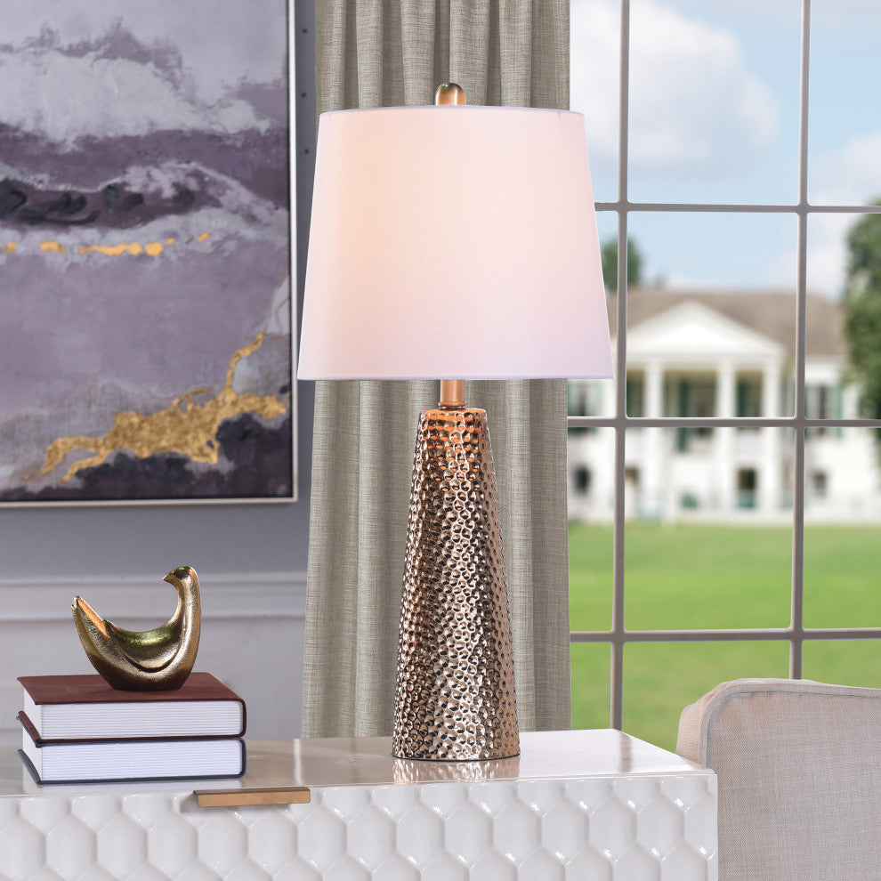 Complete your house''s primary suite with the beautiful Christy table lamp. It is constructed from ceramic and features a visually-appealing golden copper finish on both the body and hardware. The white styrene shade ensures this lamp will stay with you even if you decide to move homes at some point.