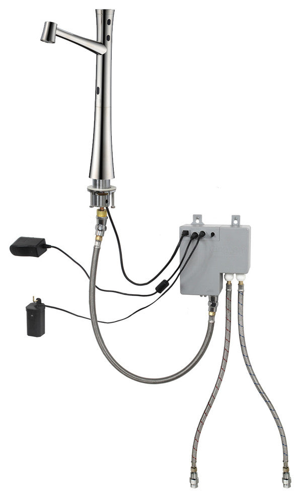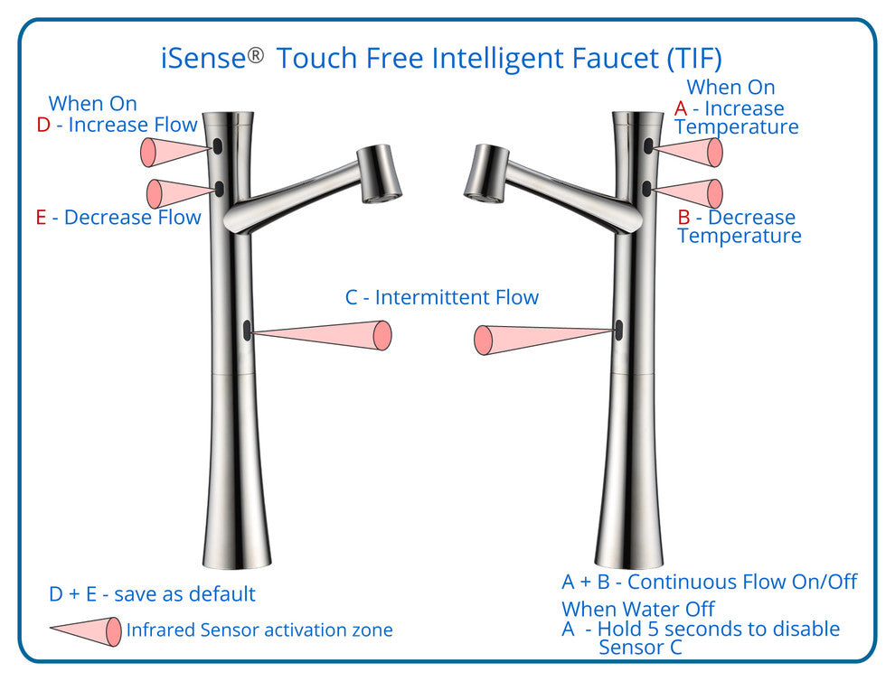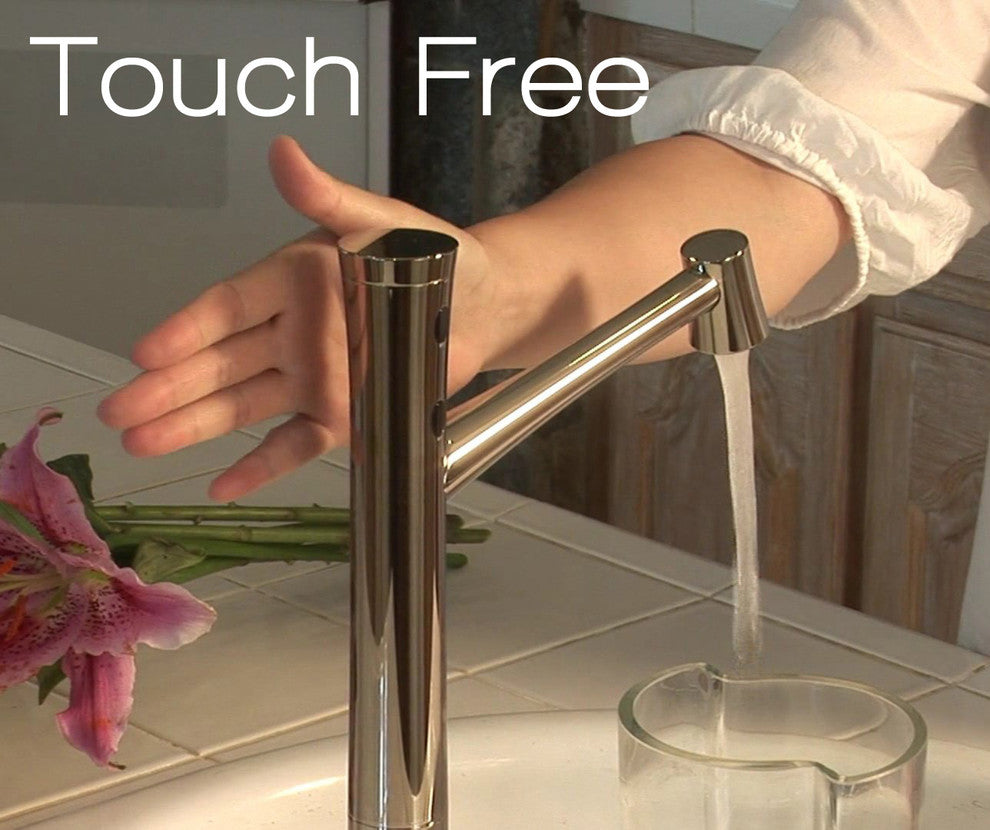 The world''s FIRST and BEST newly invented Automatic Touch Free Smart Sensor Faucet has taken the use of faucets to a next level and sets a new standard for the Touch Free Faucet industry. The innovative & intelligent iSense touch free technology provides an easy to install, easy to use, convenient and unique faucet experience. No handles or buttons to operate - completely touch free operation ensures that there is minimal risk of spreading or contact of germs & bacteria, a great design concept that improves personal hygiene and prevents cross contamination, and to promote water conservation for commercial and residential applications. Thirteen functions combined in five sensors provide completely touch-free convenience to make everyday task easier. Full water temperature and water flow control without touching the faucet. Three user-defined water temperature and water flow settings for personal convenience. Patented "Pause" function save up to 70% water and for working in the sink area and cleaning. Continuous water flow function for continuous water service and container filling operation. Maximum water temperature setting adjustment for ADA compliant. No scalding risk for any age (kids, elders & the disabled). Single hole mount for less counter clutter and easy operation. Solid brass construction for durability. Simple and easy installation. Includes 5 infrared sensors, Digital Controller, cold and hot water supply hoses. A 120/240 AC/DC 6 volt adapter and 4 AA backup battery for continuous use during electric power outage.The world''s FIRST and BEST newly invented Completely Touch Free Faucet has taken the use of faucets to a next level and sets a new standard for the Touch Free Faucet industry. The innovative & intelligent iSense touch free technology provides an easy to install, easy to use, convenient and unique faucet experience. No handles or buttons to operate - completely touch free operation ensures that there is minimal risk of spreading or contact of germs & bacteria, a great design concept that improves personal hygiene and prevents cross contamination, and to promote water conservation for commercial and residential applications.