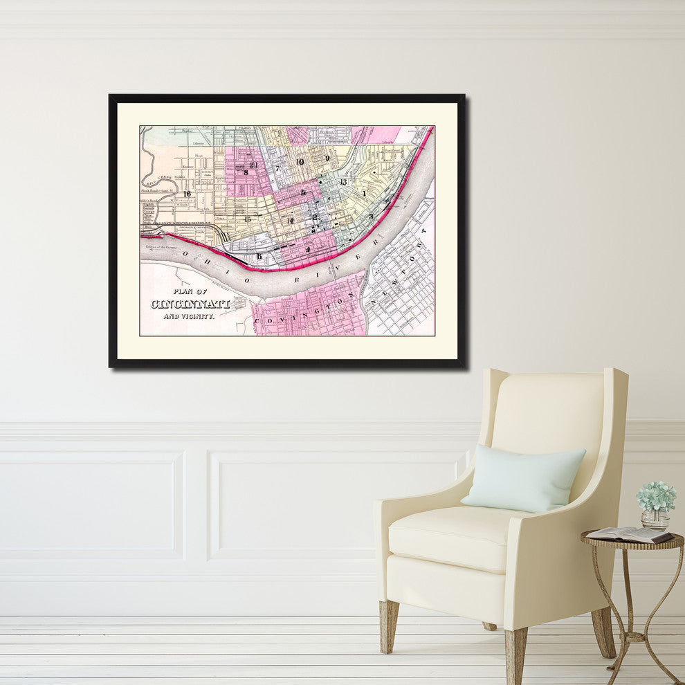 Cincinnati Vintage Map Print On Canvas With Picture Frame, 28" X 37"