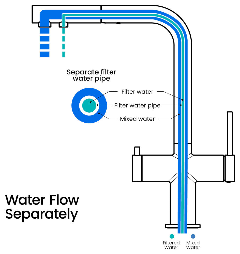 Experience the perfect fusion of modern aesthetics and unmatched functionality with our Circular 2-in-1 Water Filter Kitchen Faucet. The 2-in-1 design simplifies your kitchen setup, eliminating the need for a separate filter faucet, and thereby streamlining the appearance and efficiency of your culinary space. It features with two separate supply lines for regular tap water and filtered water. This intelligent design not only prevents cross-contamination but also guarantees that you enjoy purified, great-tasting water every time you turn on the tap.