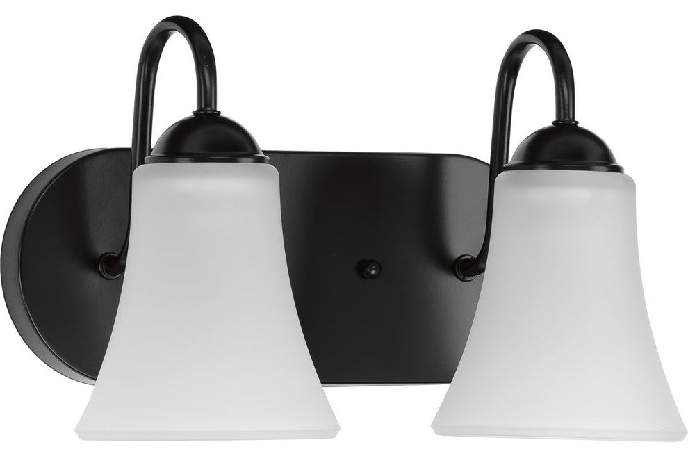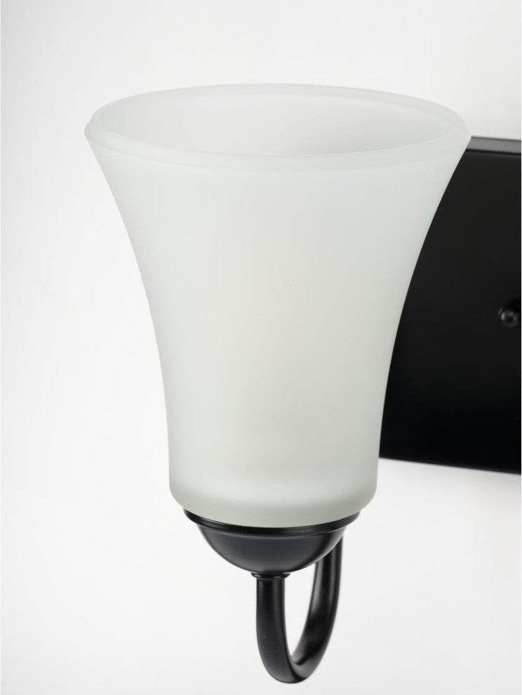 Make a room-defining statement with the Classic two-light bath in any transitional interior. Bell-shaped, etched glass shades contract against a bold, Black curved backplate. Delicate curved arms extend to hold the elegant light sources as they offer warm task lighting on either side of a bathroom mirror, in a dining room, or wherever focused task lighting is called upon.