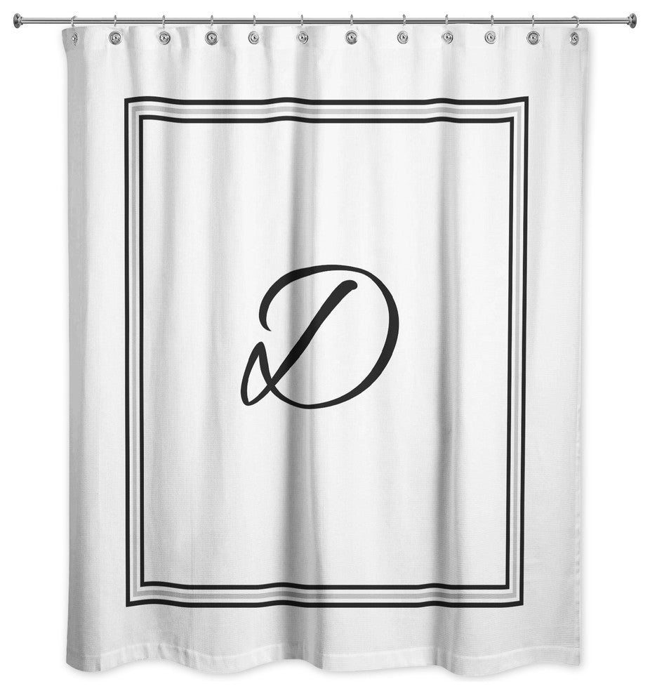 Personalize your bathroom with this classic Black & White Monogrammed Shower Curtain. Choose your initial in a classic script font in in black on a white background. This clean design will add a classic elegance to any bathroom. 100% softened polyesterMeasures 71" L x 74" WStandard size with 12 stitch-enforced eyelets for hangingShower rod, rings, or liner not includedMade in USA of imported materialsPersonalized with initialed monogramCare Instructions: Machine Wash Separately in Cold Water, Delicate Cycle, Do Not Bleach, Tumble Dry Low, Press with Low Heat Shower curtains are made stitched enforced eyelits for hanging. Grommets, hooks and rod are not included.