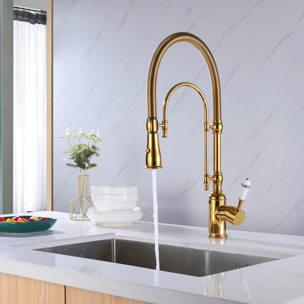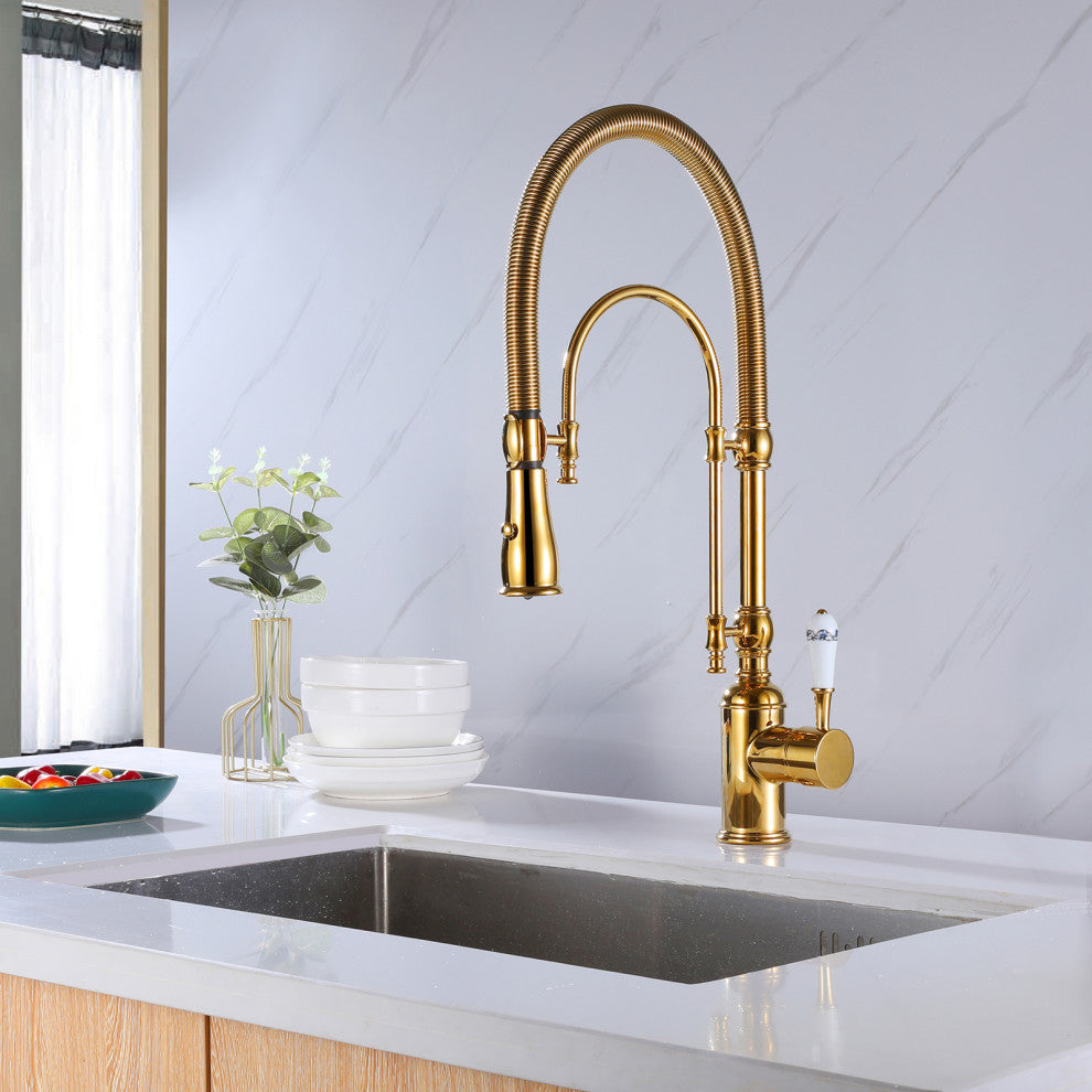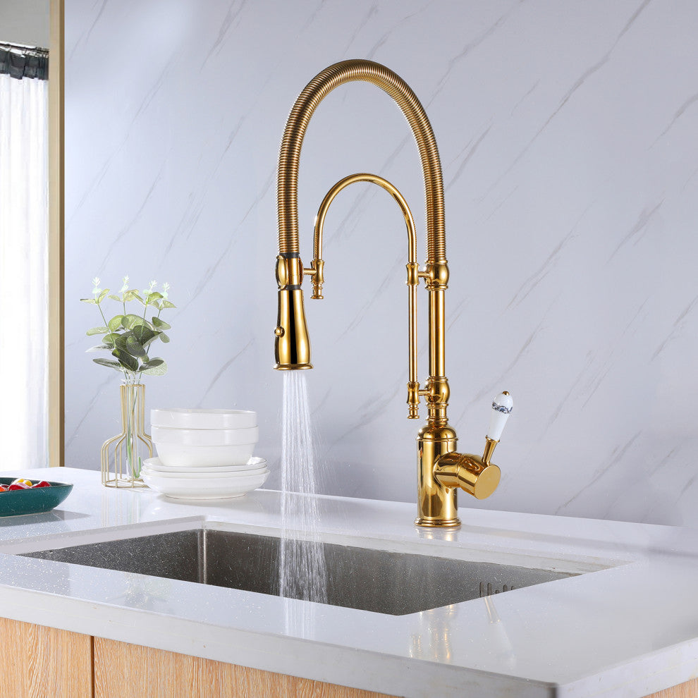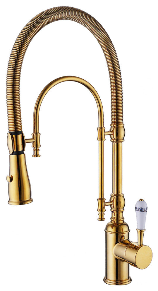 Life needs the embellishment of art. This kitchen faucet offers functional water performance with aesthetically-attractive design for your kitchen. Polished gold finish makes your kitchen fashionable and bright. Made from solid brass and paired with durable ceramic cartridge, it is designed for long-lasting performance. 360° swiveling range are suitable for both single bowl and double bowl kitchen sink."”"”What''s Included?Spray"”"”Features:-Solid Brass Construction delivers the utmost in beauty, durability and long-lasting performance.-Gold plating finish prevents water spots and fingerprints for a cleaner faucet, which resists corrosion, and is exceptionally easy-to-keep-clean.-Two spray modes: It is easy to switch between aerated stream and powerful rinse spray.-Single lever handle control temperature and water flow effortlessly.-Installation has been upgraded, including all parts for installation. It''s easy to install.Flow Rate: 2.4GPMWARRANTY:5 Years Limited (residential), 1 Year Limited (commercial)-Note: due to their reflective nature, the appearance of gold finishes can vary depending on the lighting in your kitchen. Warmer or cooler light, as well as hues of surrounding objects, can affect the way your faucet looks. Actual appearance when installed in the home environment may differ slightly from the images shown.
