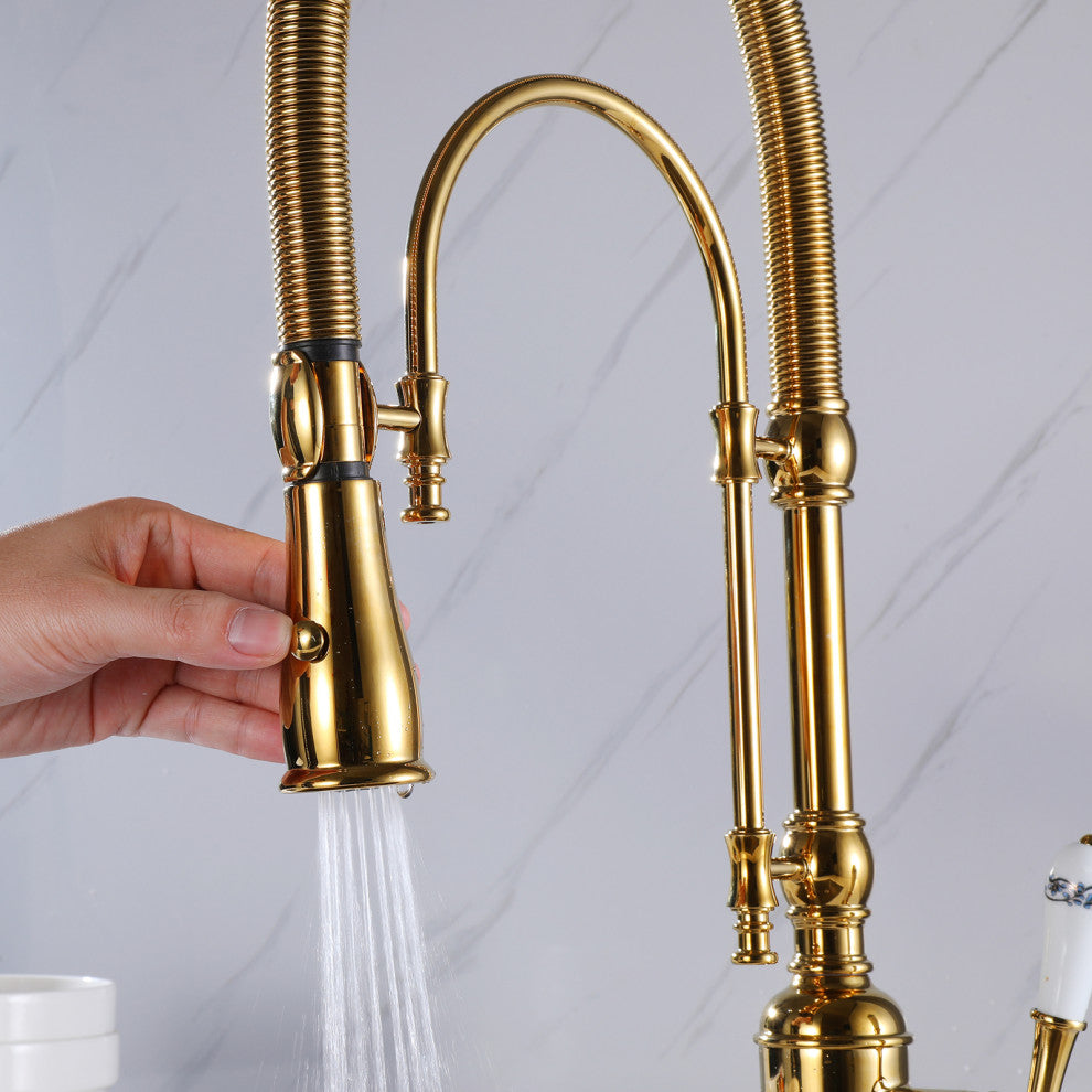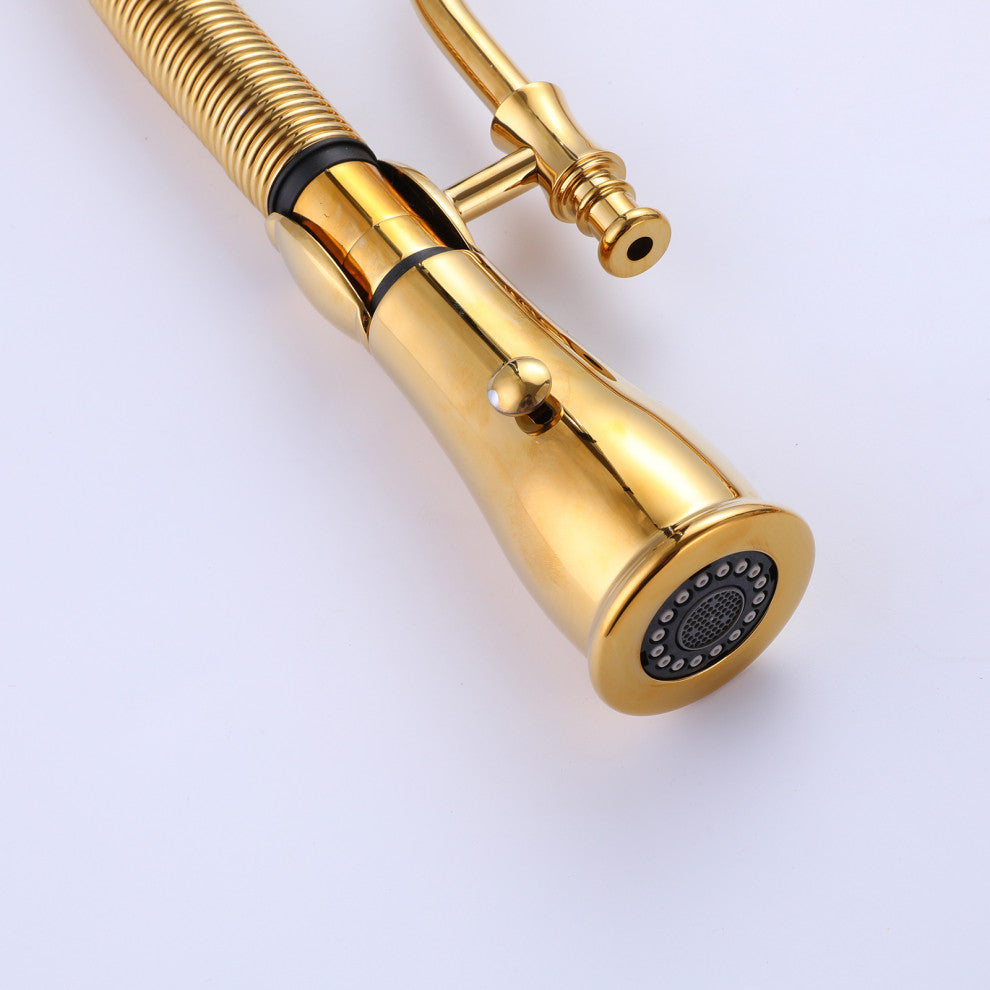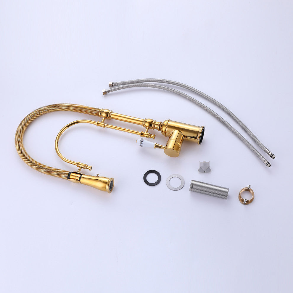 Life needs the embellishment of art. This kitchen faucet offers functional water performance with aesthetically-attractive design for your kitchen. Polished gold finish makes your kitchen fashionable and bright. Made from solid brass and paired with durable ceramic cartridge, it is designed for long-lasting performance. 360° swiveling range are suitable for both single bowl and double bowl kitchen sink."”"”What''s Included?Spray"”"”Features:-Solid Brass Construction delivers the utmost in beauty, durability and long-lasting performance.-Gold plating finish prevents water spots and fingerprints for a cleaner faucet, which resists corrosion, and is exceptionally easy-to-keep-clean.-Two spray modes: It is easy to switch between aerated stream and powerful rinse spray.-Single lever handle control temperature and water flow effortlessly.-Installation has been upgraded, including all parts for installation. It''s easy to install.Flow Rate: 2.4GPMWARRANTY:5 Years Limited (residential), 1 Year Limited (commercial)-Note: due to their reflective nature, the appearance of gold finishes can vary depending on the lighting in your kitchen. Warmer or cooler light, as well as hues of surrounding objects, can affect the way your faucet looks. Actual appearance when installed in the home environment may differ slightly from the images shown.