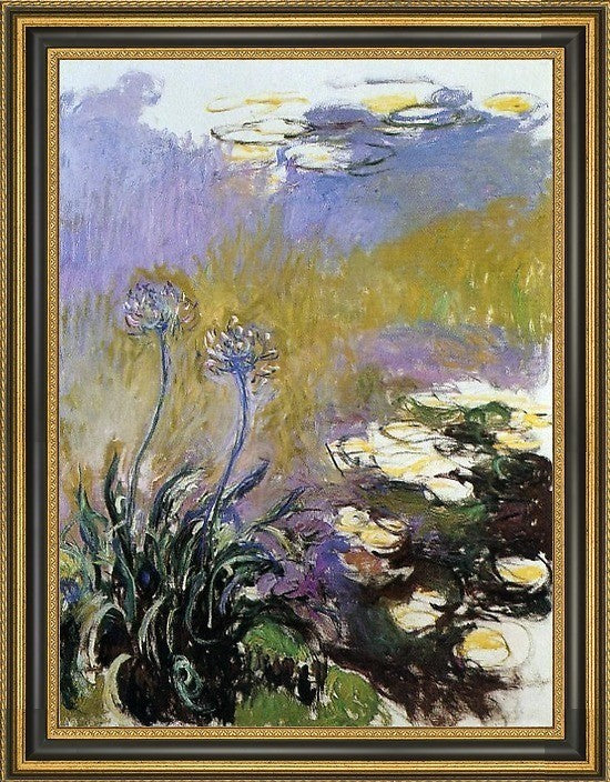 21" x 28" Claude Oscar Monet Agapanthus framed premium canvas print reproduced to meet museum quality standards. Our Museum quality canvas prints are produced using high-precision print technology for a more accurate reproduction printed on high quality canvas with fade-resistant, archival inks. Our progressive business model allows us to offer works of art to you at the best wholesale pricing, significantly less than art gallery prices, affordable to all. This artwork is hand stretched onto wooden stretcher bars, then mounted into our 3 3/4" wide gold finish frame with black panel by one of our expert framers. Our framed canvas print comes with hardware, ready to hang on your wall. We present a comprehensive collection of exceptional canvas art reproductions by Claude Oscar Monet .