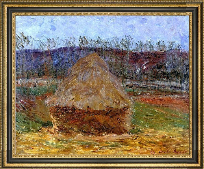 16" x 20" Claude Oscar Monet Grainstack at Giverny framed premium canvas print reproduced to meet museum quality standards. Our Museum quality canvas prints are produced using high-precision print technology for a more accurate reproduction printed on high quality canvas with fade-resistant, archival inks. Our progressive business model allows us to offer works of art to you at the best wholesale pricing, significantly less than art gallery prices, affordable to all. This artwork is hand stretched onto wooden stretcher bars, then mounted into our 3 3/4" wide gold finish frame with black panel by one of our expert framers. Our framed canvas print comes with hardware, ready to hang on your wall. We present a comprehensive collection of exceptional canvas art reproductions by Claude Oscar Monet.