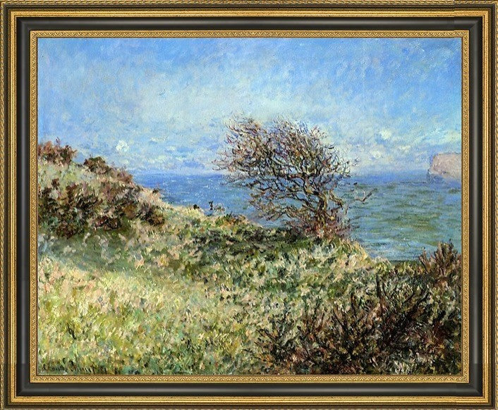 16" x 20" Claude Oscar Monet On the Cliff at Fecamp framed premium canvas print reproduced to meet museum quality standards. Our Museum quality canvas prints are produced using high-precision print technology for a more accurate reproduction printed on high quality canvas with fade-resistant, archival inks. Our progressive business model allows us to offer works of art to you at the best wholesale pricing, significantly less than art gallery prices, affordable to all. This artwork is hand stretched onto wooden stretcher bars, then mounted into our 3 3/4" wide gold finish frame with black panel by one of our expert framers. Our framed canvas print comes with hardware, ready to hang on your wall. We present a comprehensive collection of exceptional canvas art reproductions by Claude Oscar Monet.