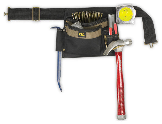 CLC premium quality, top grain leather nail and tool bag with 2 main pockets and 6 smaller pockets and sleeves to hold a variety of nails, fasteners, and tools, includes a hammer loop and a tape measure clip.Highlights: Made of 600D polyester fabric and 1680D ballistic nylon binding2 Main nail/tool pockets and 4 smaller pockets fit pliers, nail sets, pencils, knife, etcMetal clip holds all measuring tape sizes2" Wide web belt fits waists up to 46"