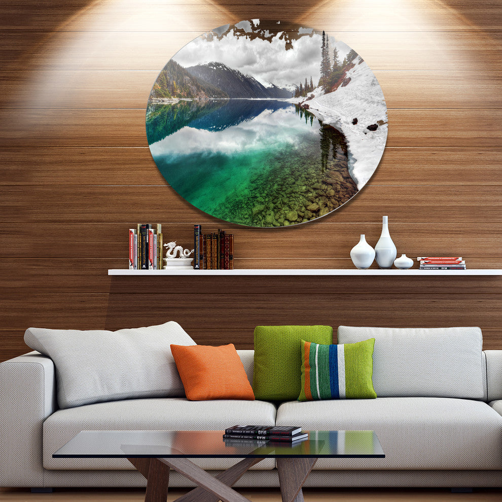 Bring Contemporary Abstraction to your home with this large Circle Metal wall art. This Clear Lake Pine Trees and Mountains Metal Artwork makes it the focal point of any room or office.