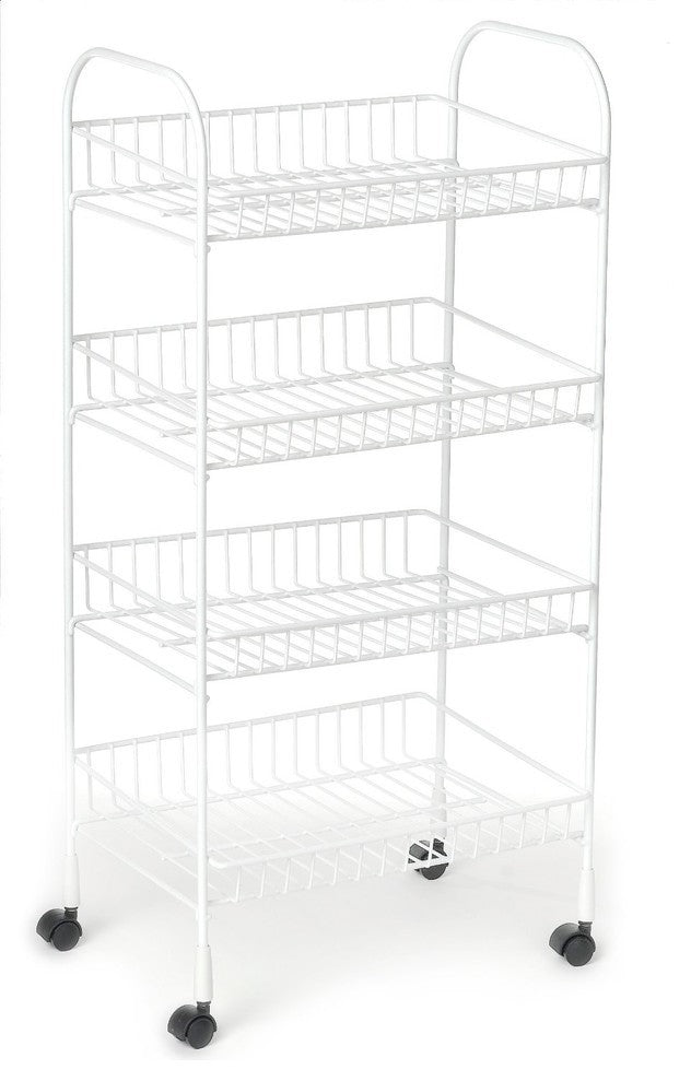 Highlights:Height: 34.62"Width: 16.75"Depth: 12.37"Material: Epoxy coated steelColor: White4-tier rolling cart for storing and transporting small itemsSmooth rolling wheels for easy movement and scratch free floorsEpoxy coated steel construction for optimal supportStores and transports laundry detergents, bath products, cleaners, towelsEasy to assemble