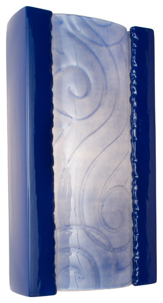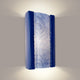 This one-of-a-kind wall light integrates fused art glass made from reclaimed window glass and kiln-fired glazed ceramic. Light shines from the top and bottom of the fixture as well as through the translucent pane featuring a textured pane of glass incised with airily spirals and winding lines. The Cobalt Blue, rectangular ceramic frame curves in gently at the back and supports a convex pane of Sapphire glass. Subtle color and texture variations are the hallmark of a truly handcrafted piece of art.