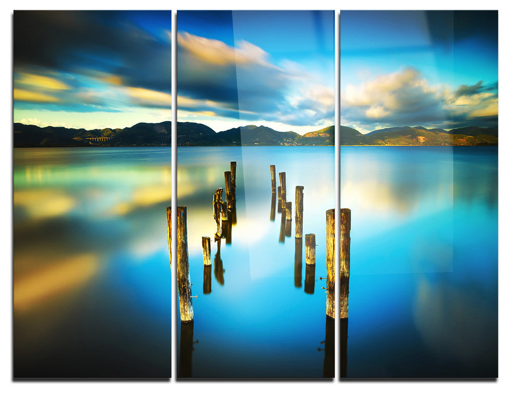 "Cloudy Lake With Broken Pier" Photo Metal Wall Art, 3 Panels, 36"x28"