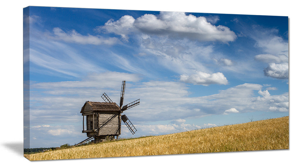 The Cloudy Sky and Windmill Summer day canvas art print is sure to make an impression on anyone who sees it. This artwork is gallery wrapped around a 1-inch solid wood frame and arrives carefully packaged and entirely ready to hang on the wall. Design Art only uses the highest resolution and pigments to ensure a crisp colorful print that is never faded or pixelated. This artwork is sure to be a conversation starter in any home or office.