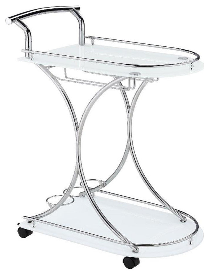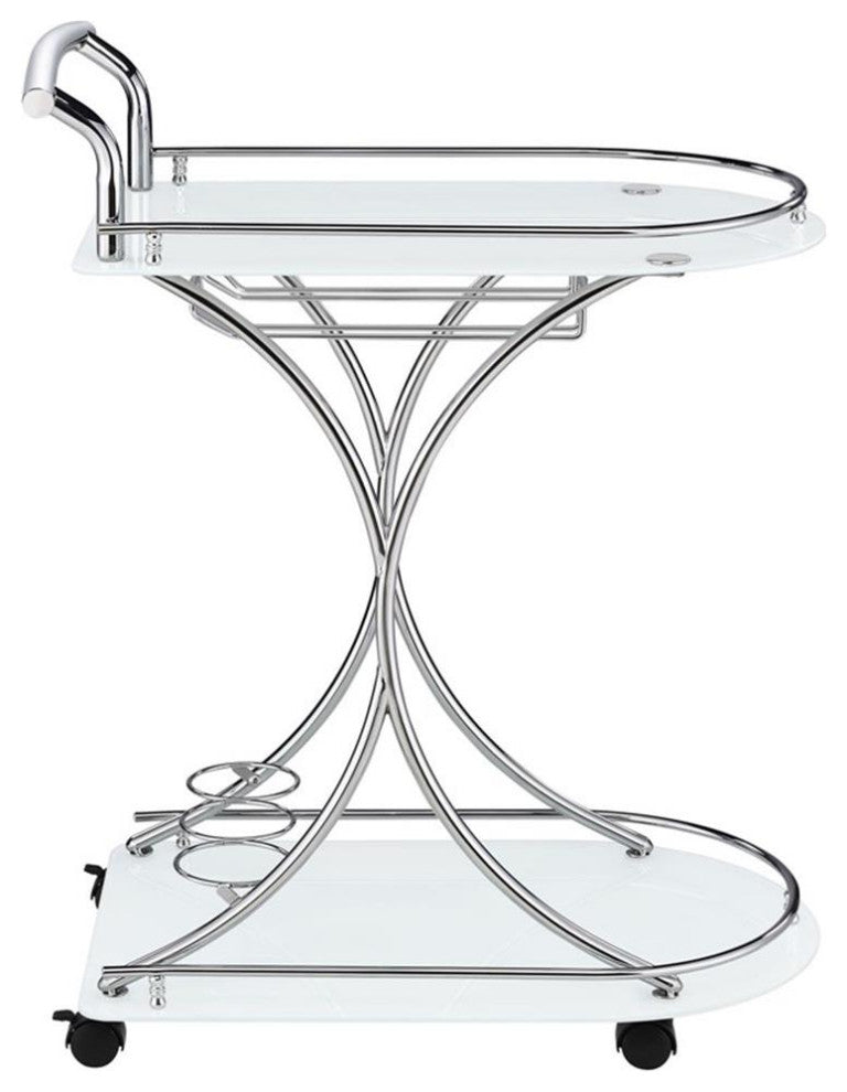 Mobile and beautiful describe the motif of this gorgeous serving cart. With a romantic mid-century look, its slender silhouette delivers elegance and utility. Enjoy a curved frame made from chrome finish metal, and two white glass shelves that aid in serving and storing. An upper stemware rack and lower wine bottle holders make it a breeze to keep guests entertained and satiated. Caster wheels allow mobility around a serving space.Features: • Includes: One (1) serving cart • Metal finish: Chrome • Glass: White tempered glass • Materials: Glass, metal • Impress your guests with this contemporary serving cart • Two (2) tiers of white tempered glass shelving with guardrails enhance strength and style for top-notch entertaining • Stemware rack and three (3) bottle wine rack add storage for necessary elements • Lockable casters hold cart in place and also allow free movement • Features included: 2 glass shelves and 4 casters • Number of glassware capacity: 4 (2 glass holders) • Number of wine bottle capacity: 3 (1 bottle holder) • Width of the wine glass holder: 3.75" • Shape: RectangularSpecifications: • Product Dimensions: 33.75" H x 26.5" W x 15.75" D • Product Weight: 18.7 lbs • Number of Shelves: 2 • Assembly Required: Yes • Warranty: One (1) year limited manufacturer warranty