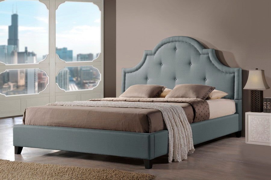 Think how much you ll look forward to dreamtime with our queen-size platform bed. Gray linen upholstery and a wooden frame with foam padding take care of the comfort angle while dark brown wood legs and scalloped headboard cover the style side of things. A great bedroom-furniture discount buy!