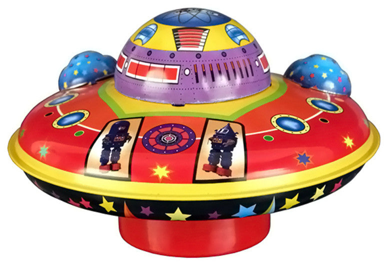 The Collectible Tin Flying Saucer Toy makes the perfect gift for someone who enjoys collecting classic knickknacks! Featuring a colorful finish, this toy operates via key-wind. The toy rolls forward, stops, spins around, then moves forward again. Made in China, the toy measures 4.25 by 5 inches and is recommended for adult collectors.