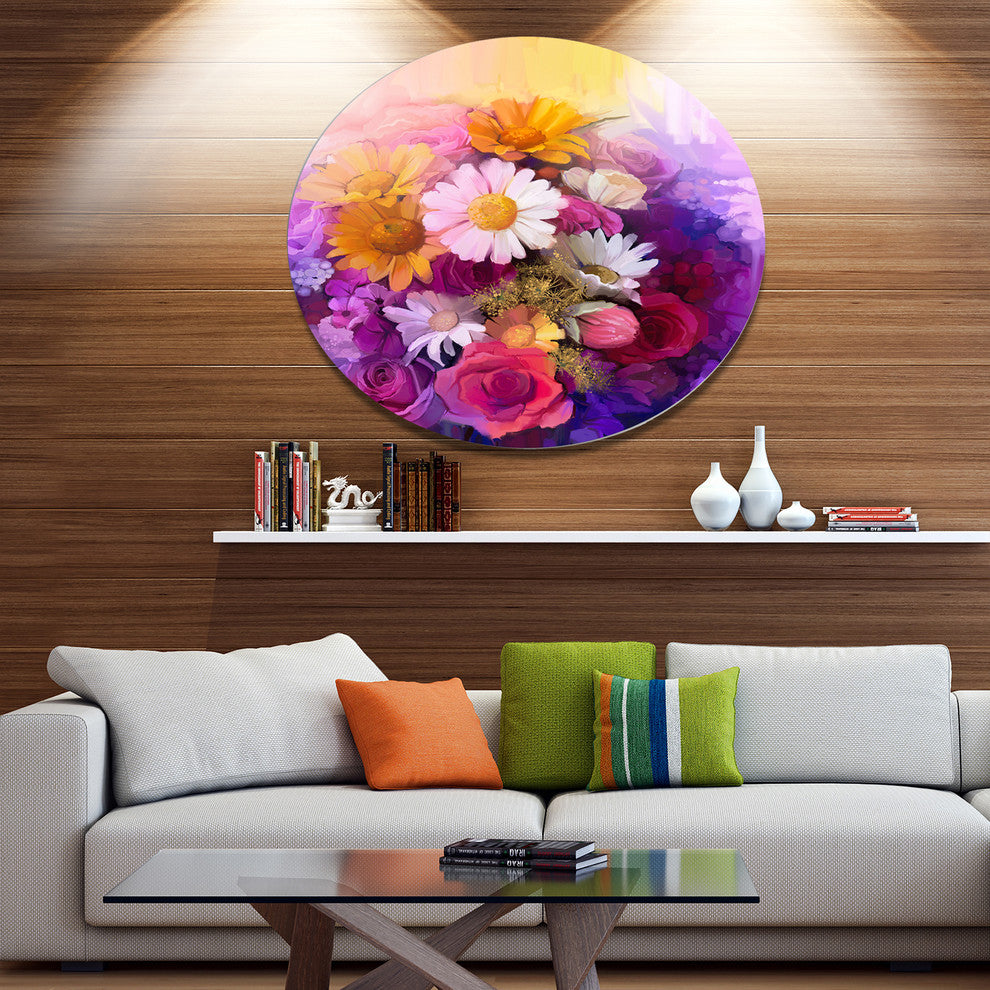 Bring Contemporary Abstraction to your home with this large Circle Metal wall art. This Colorful Bouquet of Different Flowers Metal Artwork makes it the focal point of any room or office.