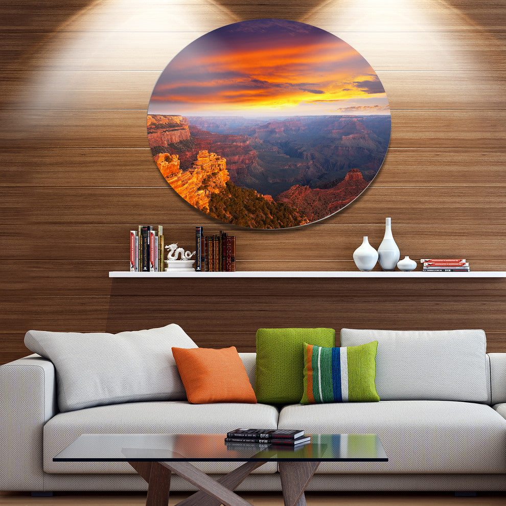 Bring Contemporary Abstraction to your home with this large Circle Metal wall art. This Colorful Grand Canyon At Sunset Metal Artwork makes it the focal point of any room or office.