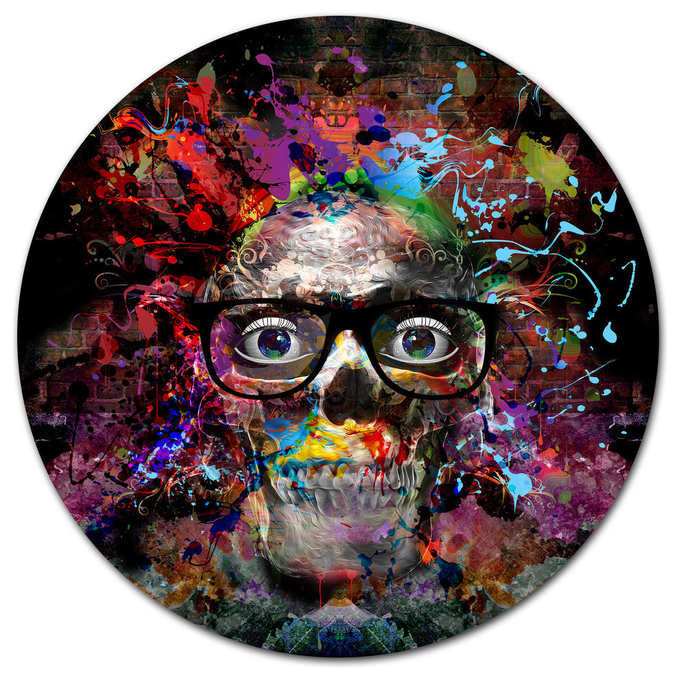 Bring Contemporary Abstraction to your home with this large Circle Metal wall art. This Colorful Human Skull with Glasses Metal Artwork makes it the focal point of any room or office.