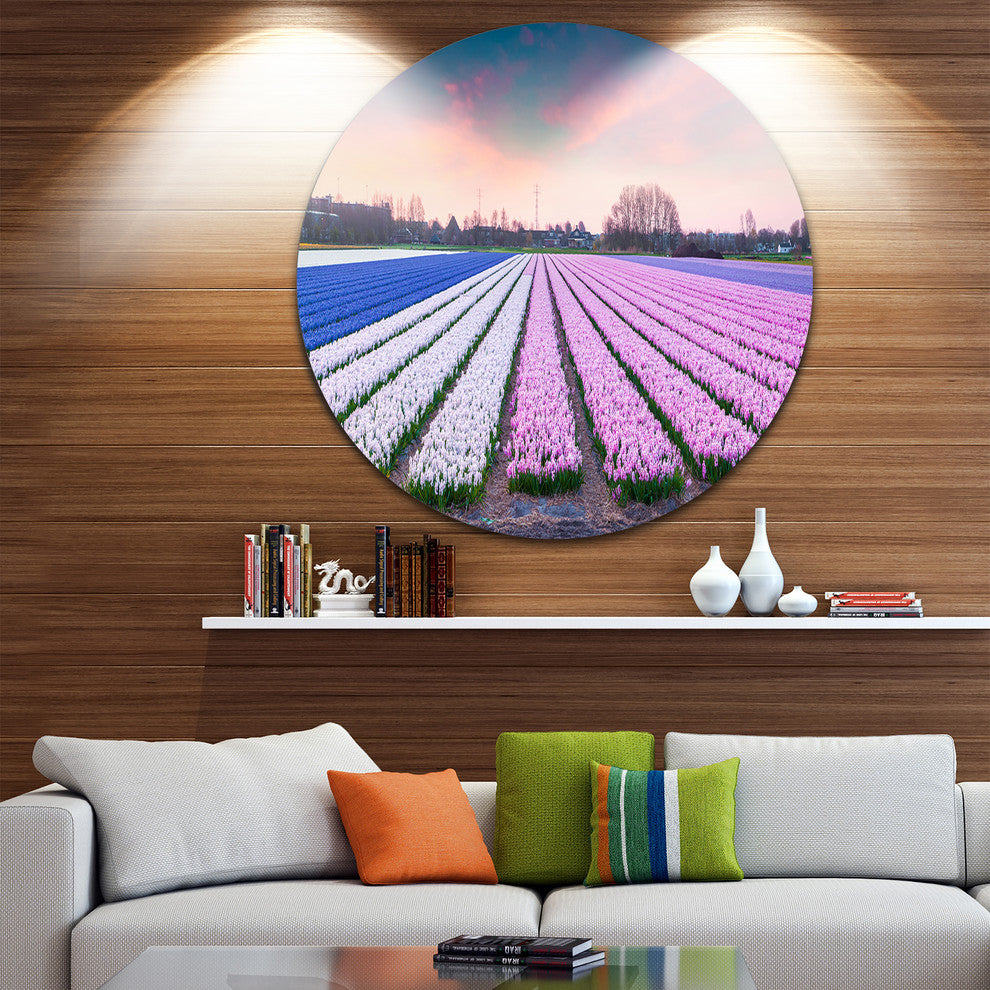 Bring Contemporary Abstraction to your home with this large Circle Metal wall art. This Colorful Hyacinth Flowers at Sunrise Metal Artwork makes it the focal point of any room or office.