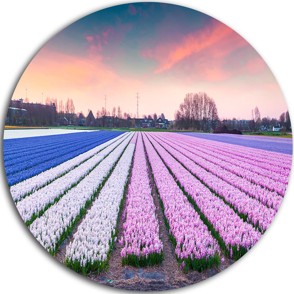 Bring Contemporary Abstraction to your home with this large Circle Metal wall art. This Colorful Hyacinth Flowers at Sunrise Metal Artwork makes it the focal point of any room or office.