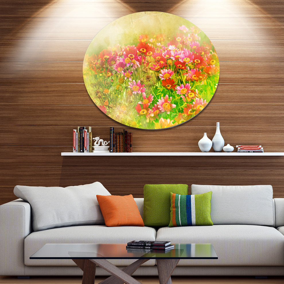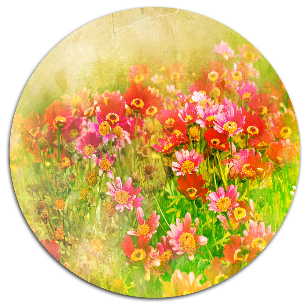 Bring Contemporary Abstraction to your home with this large Circle Metal wall art. This Colorful Spring Garden with Flowers Metal Artwork makes it the focal point of any room or office.