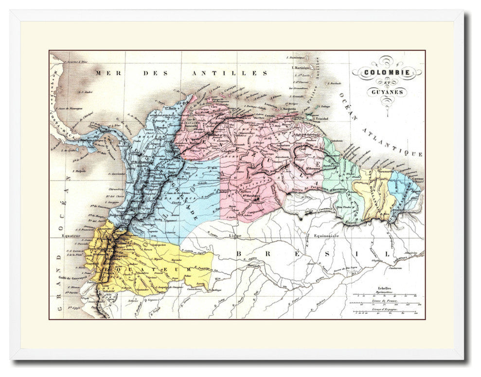 Columbia Venezuela Guianna Old Map Print On Canvas With Picture Frame 28" X 37"