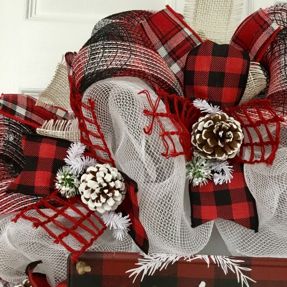 New! Large, Premium, Full Handmade Deco Mesh Winter Holiday Wreath. A large, colorful, tin sign with the wording "œComfy, Cozy Are We"� rests on a bed of pure white deco mesh. The size is a cozy black and red buffalo print and has white branches. The inner ring has premium black and red buffalo plaid ribbons and red window pane ribbons. The outer ring is made of soft fabric red/black/white plaid mesh and soft flannel plaid ribbons. Real, snow capped pine cones, with small evergreen pieces are placed around the center. It is perfect for the holiday season and all throughout winter with its rustic woodland or cabin decor. Size is large, 24 inch diameter and 6 inch depth. Please see photo for size comparison.