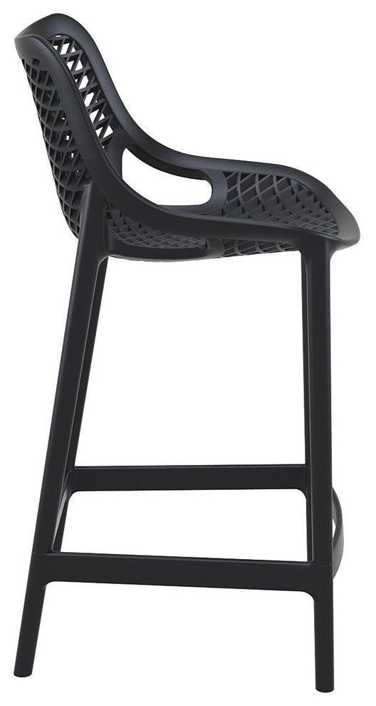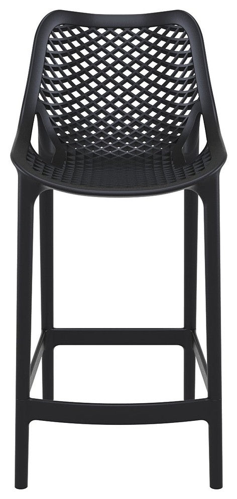 Bring cool contemporary style to the counter by way of the Air stool. This unique seat features soft curves, slim legs and a perforated design that doubles as art for your home bar, whether that bar is indoors or out.Set of 2 indoor/outdoor counter stoolsMade from polypropylene resin with gas injection molded legsPerfect for heavy-use areasWeight capacity: 300 lbs.Color: BlackMaterial: PolypropyleneDimensions: W 18" x D 18" x H 36"Seat height: 26"
