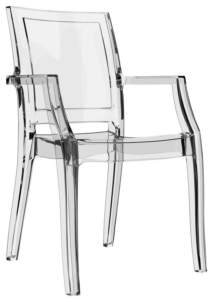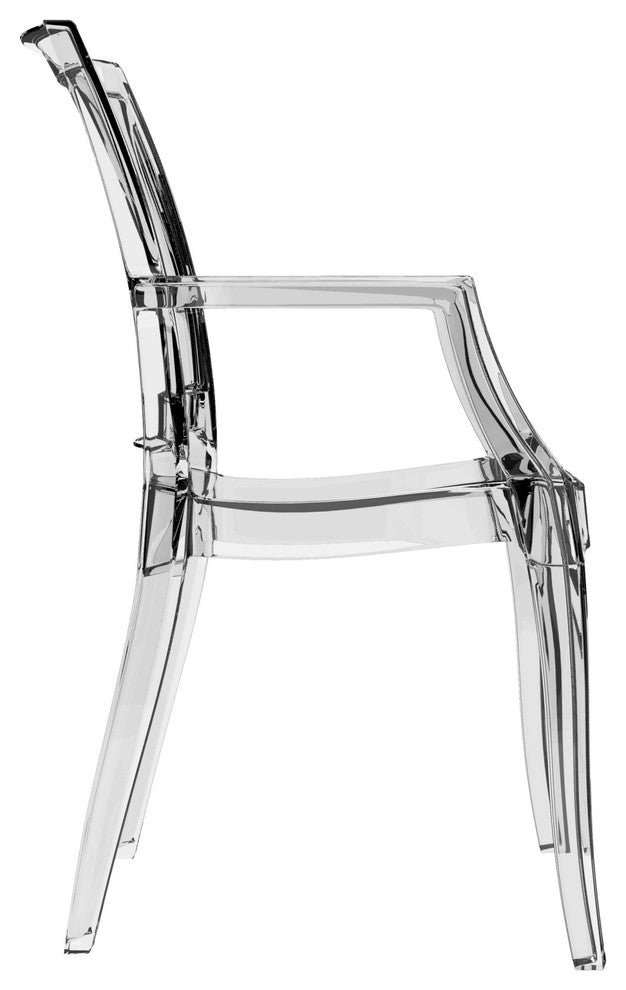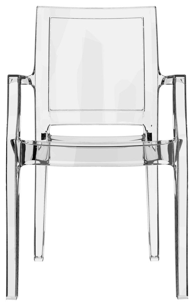The Arthur chairs prove that simple is stylish with their streamlined silhouettes and monochrome finishes. Use them to add a touch of modernity to your design and to boost your dining space''s look, indoors or out.Set of 4 polycarbonate indoor/outdoor armchairsSee-through designScratch resistantStrong legs and structureStackableFinish: ClearMaterial: PolypropyleneDimensions: W 22" x D 23" x H 36"