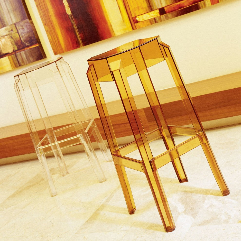 Upgrade your contemporary space with the cool Fox Bar Stools. These seats are as sturdy as they are stylish, crafted of commercial-grade polycarbonate with a scratch-resistant transparent amber finish. Slip them under the countertop for an extra dose of vitality at your home bar, or use them at a pub table on the patio for a smart outdoor design.Set of 2 bar stoolsCommercial-grade polycarbonateIndoor/outdoorScratch resistantStackableFinish: Transparent amberMaterial: PolypropyleneDimensions: W 14.2" x D 14.2" x H 29"