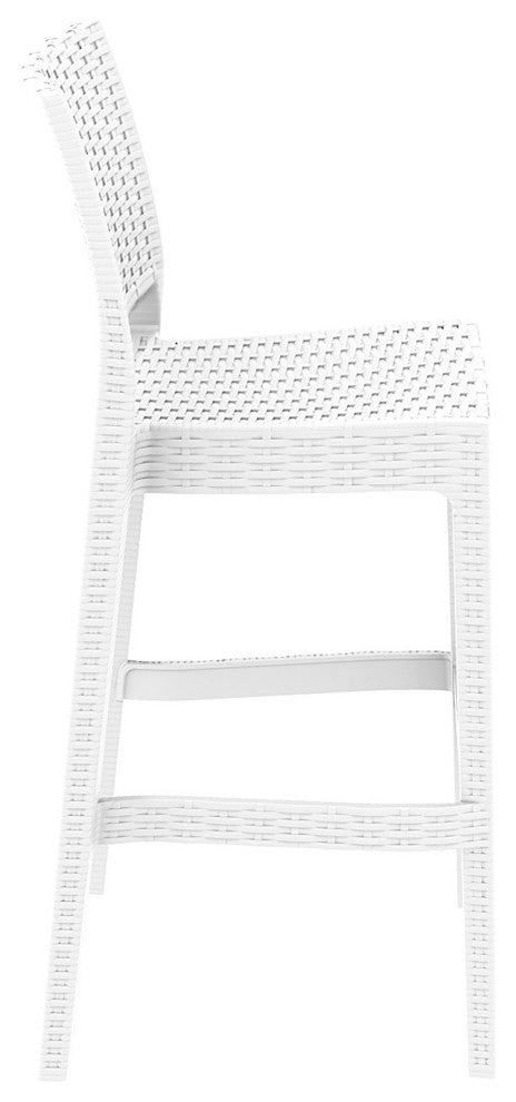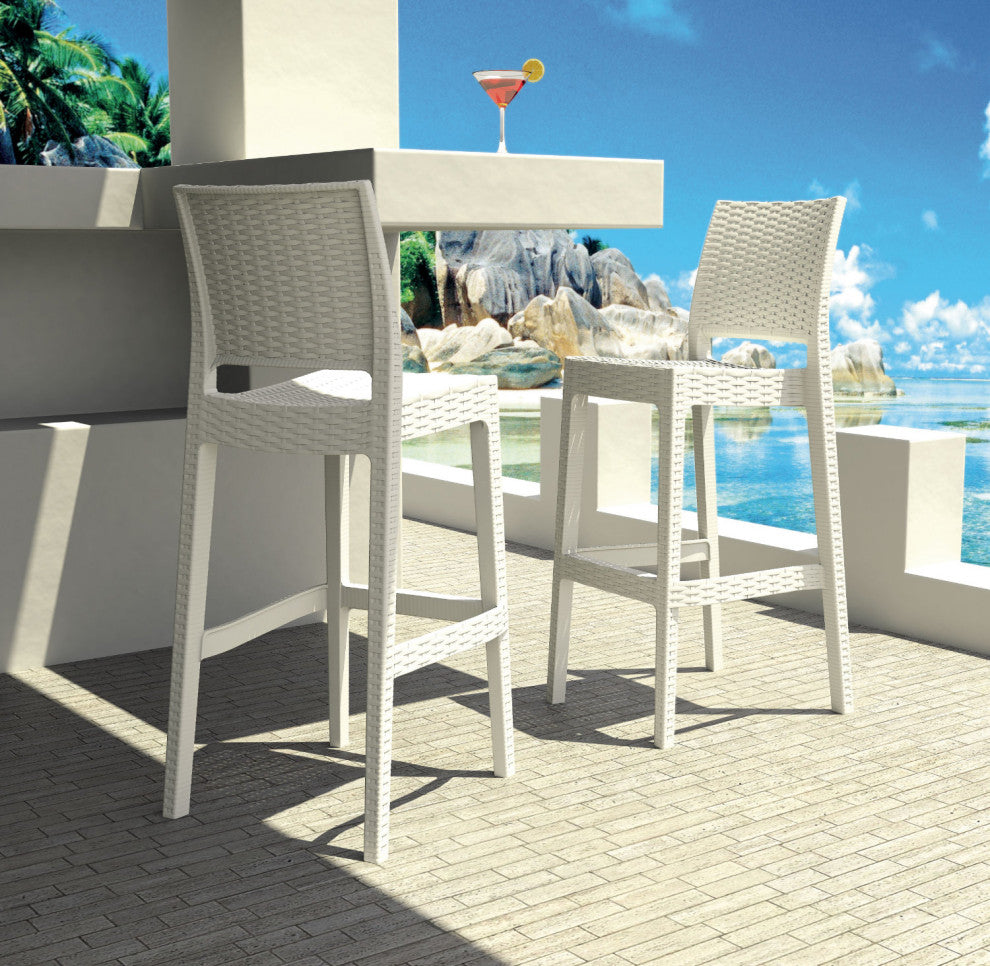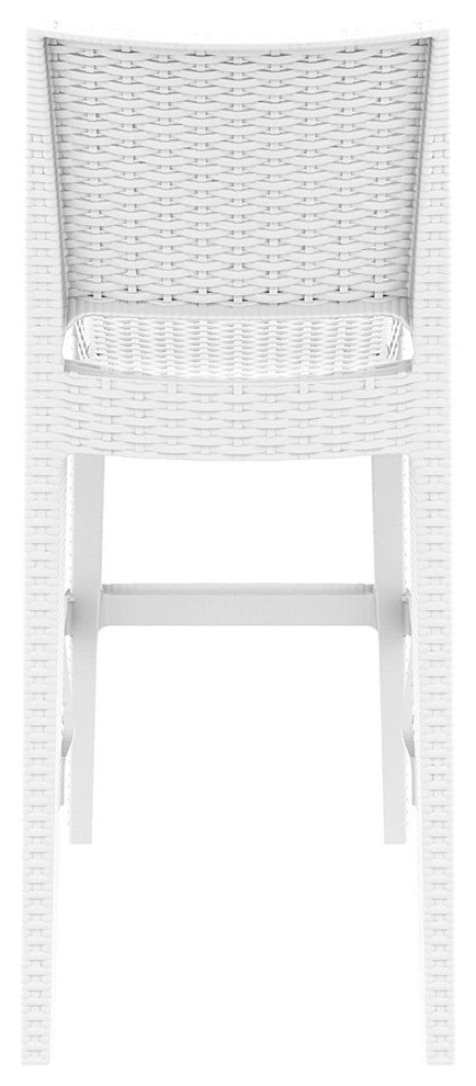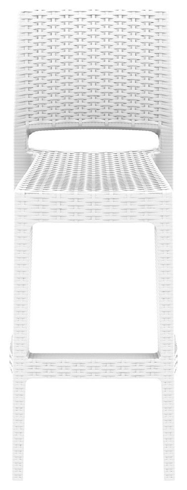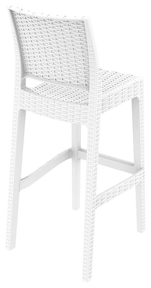 A simple yet sophisticated patio design is easy to achieve with the Jamaica bar stools in your ensemble. These high seats feature clean lines, woven wicker-look textures and crisp white finishes that sit well with any style. Whether lined up at the bar or outfitting a pub table, the Jamaica stools provide an effortless way to elevate your outdoor space.Set of 2 outdoor bar stoolsMade of durable weather-resistant resin reinforced with glass fiberWicker-look resin is a natural-looking unwoven 1-piece furniture technologyMade with open-weave design that resembles traditional woven wicker furnitureWill never unravelNo metal parts to rust, no moving parts to breakMade for commercial durabilityChairs are stackableUV treatedHose down for easy cleaningFinish: WhiteMaterial: PolypropyleneDimensions: W 37" x D 37" x H 29"