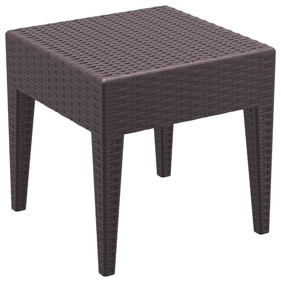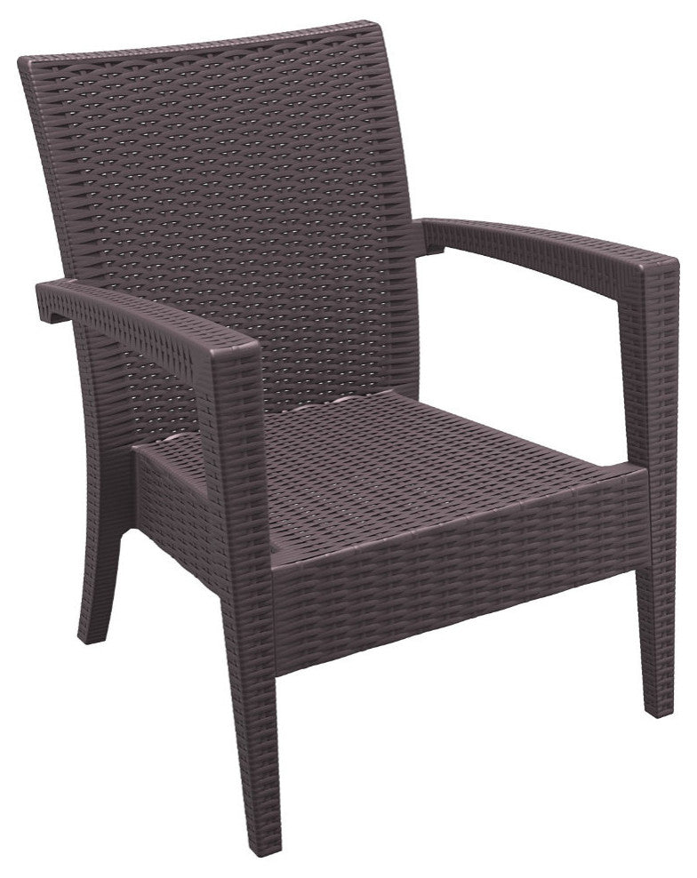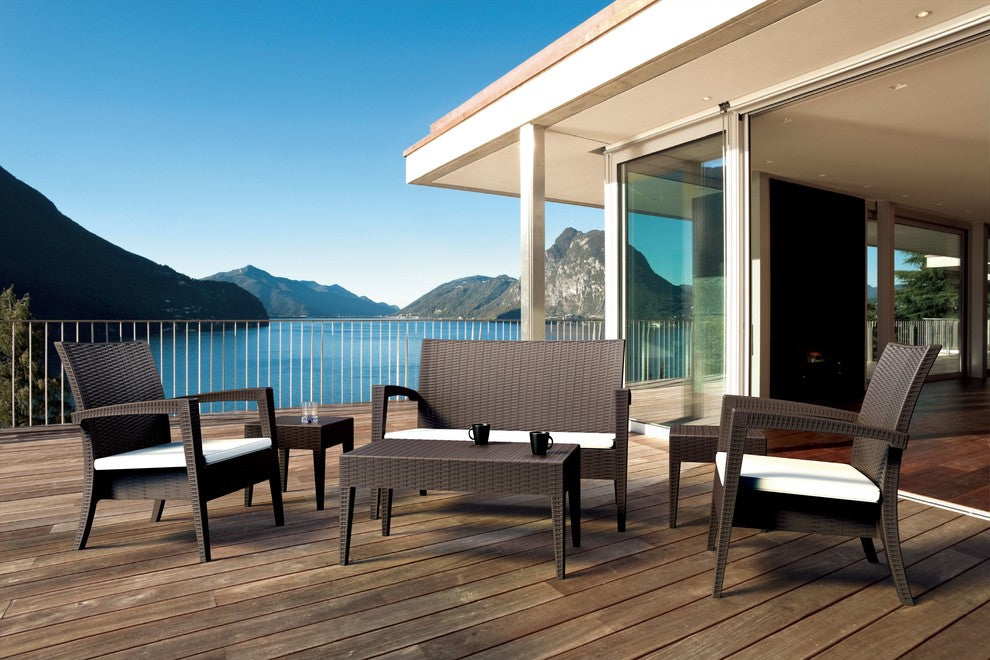 Transform your patio into a resort-style space with help from the Miami conversation set. This seating ensemble channels a modern beachside retreat with its use of clean lines, dark finishes and wicker-look elements, and is easily integrated into an outdoor space of any style. Pair it with other pieces from the Miami collection for a coordinated design.6-piece outdoor wicker-look resin conversation setIncludes love seat, 2 armchairs, coffee table and 2 side tablesIncludes 100% Acrylic Fabric Cushions in Natural colorMade using unwoven 1-piece furniture technologyWill never unravelNo metal parts to rust, no moving parts that can breakMade for commercial durabilityChairs are stackableUV treatedHose down for cleaningResistant to UV, chlorine, salt, stains, suntan oilsFinish: BrownMaterial: ResinLove seat dimensions: W 50" x D 30" x H 35"Club chair dimensions: W 28" x D 30" x H 35"Seat height (without cushion): 15"Side table dimensions: W 18" x D 18" x H 18"Coffee table dimensions: W 21" x D 36" x H 18"