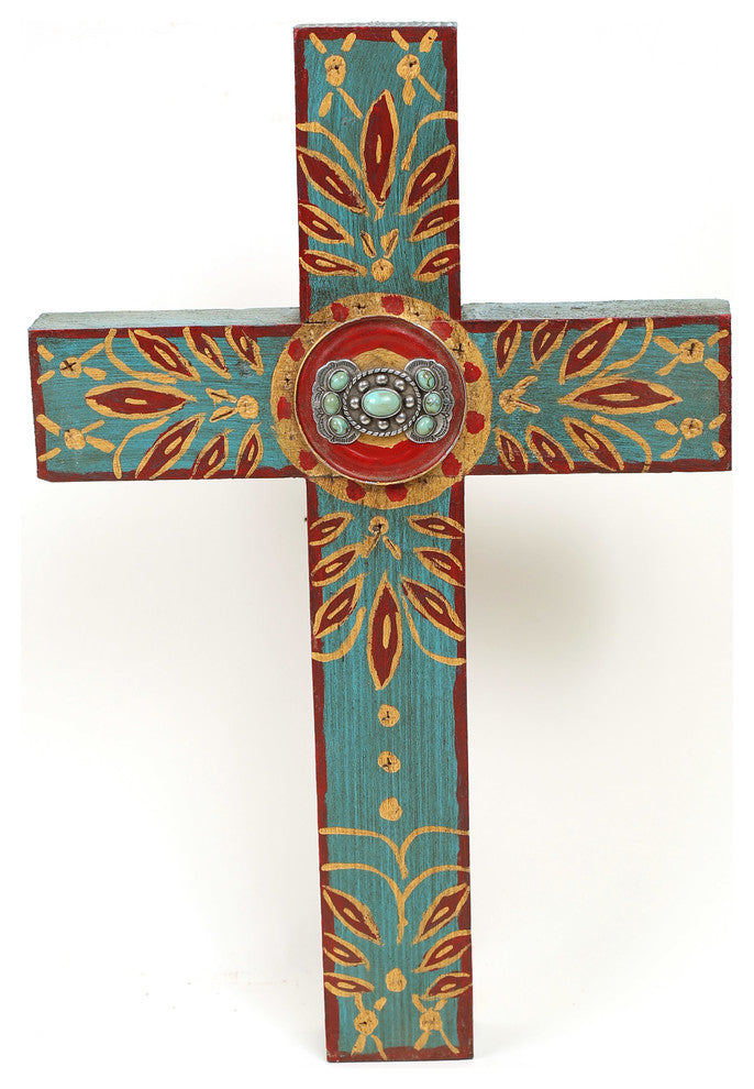Concho Handmade Wooden Cross 11x17", Turquoise
