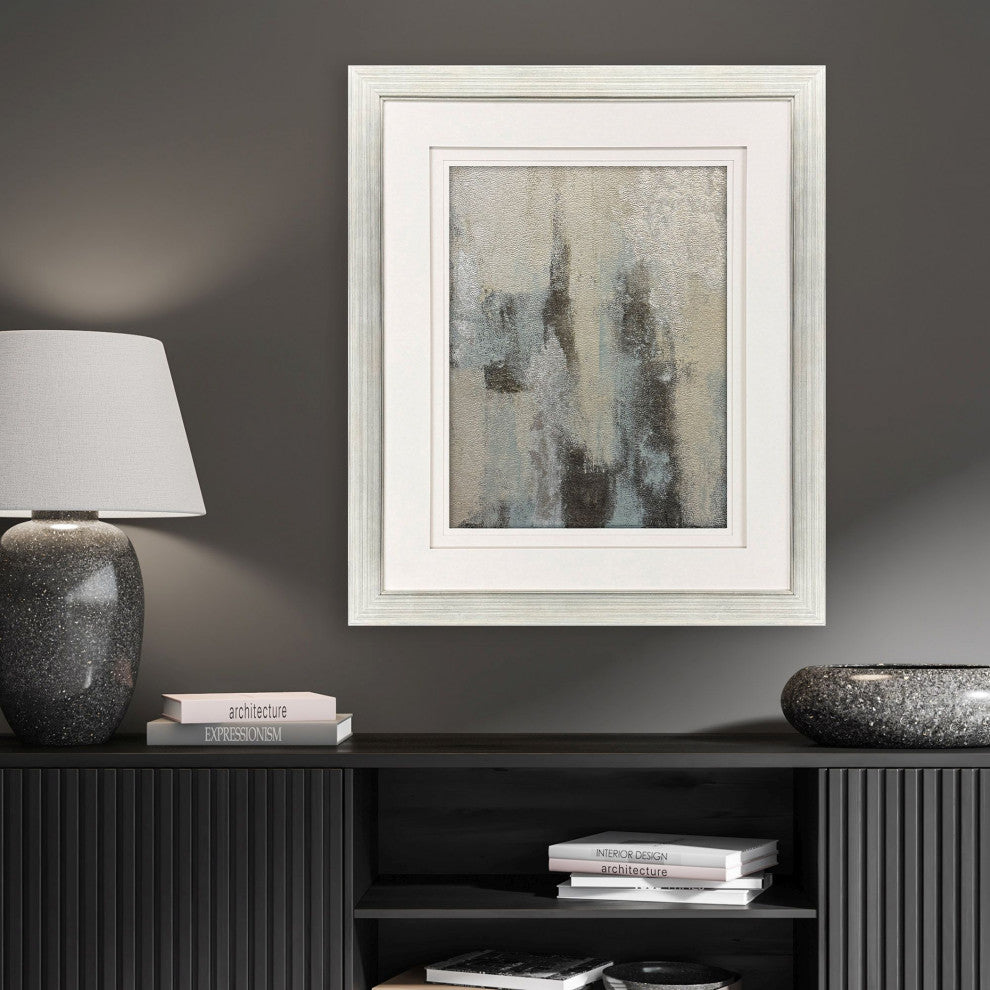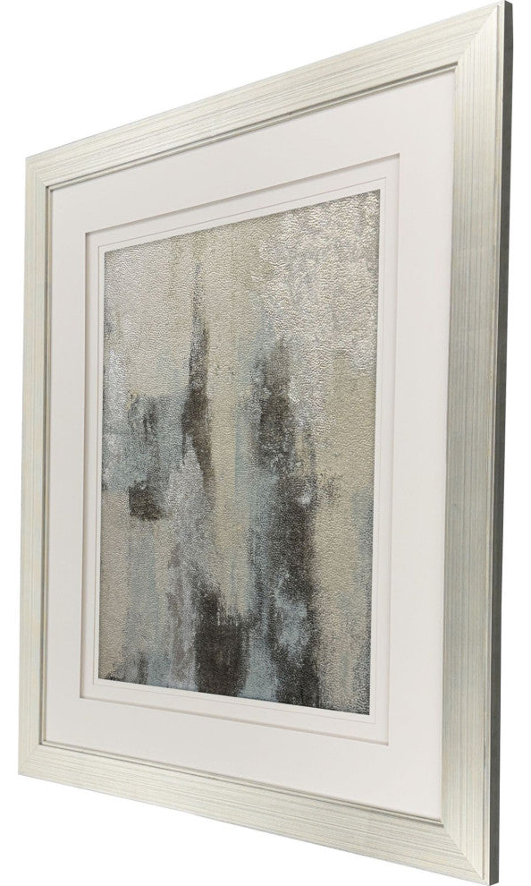 Exclusive hand finished mixed media with silver leaf accents. Matted in white with raised matting and framed in a modern silver leaf wood.