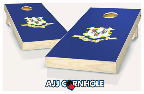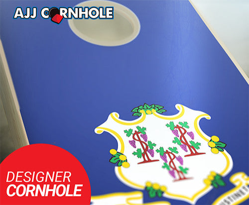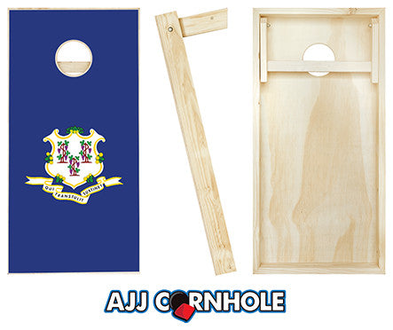 This top of the line Connecticut Flag Cornhole Set is sure to bring life to any party. Set comes ready to play with 4 red and 4 royal blue cornhole bags! All sets are made using a premium 2x4 frame and 1/2" sanded plywood playing surface. Each set has folding 2x4 legs secured with galvanized bolts.