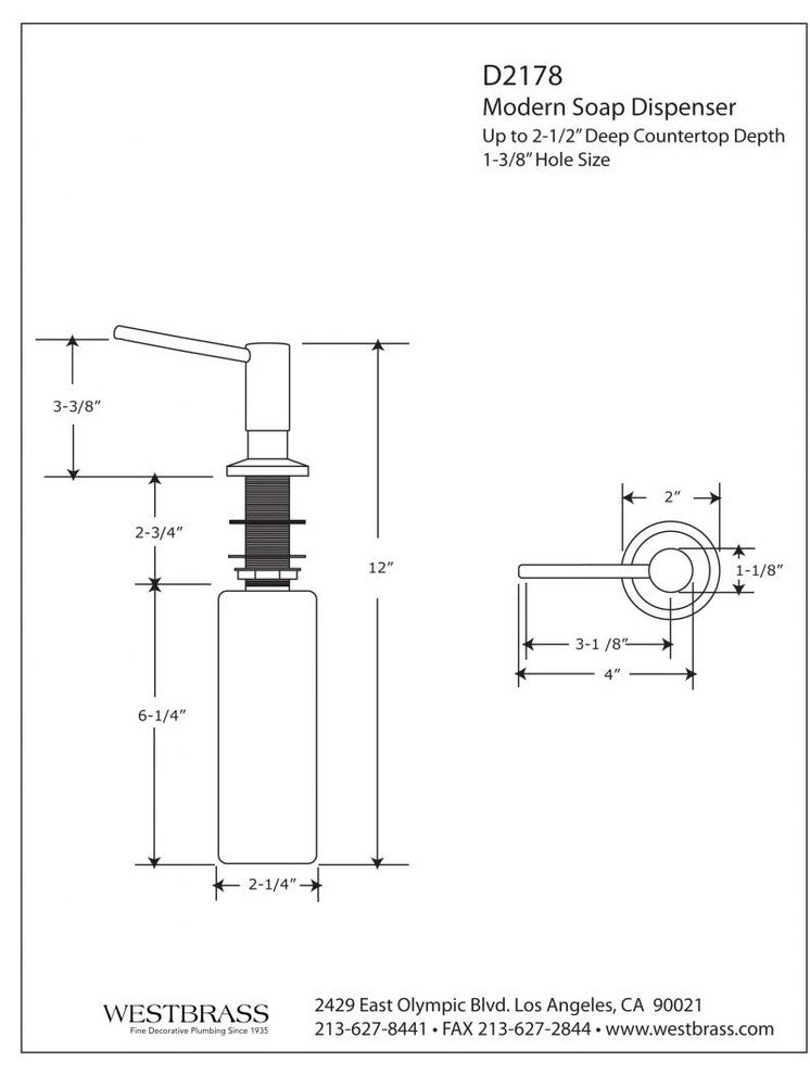 This Westbrass Contemporary soap or lotion dispenser firmly mounts in kitchen or bathroom sinks or counters. The 3-3/8 in. high dispenser extends a full 3 in. into the sink. The solid brass dispenser head, easily fills from the top of the unit and comes with an ample 12 oz. reservoir. The extended shaft height mounts in thicker countertops and its contemporary design matches today''s popular designs.
