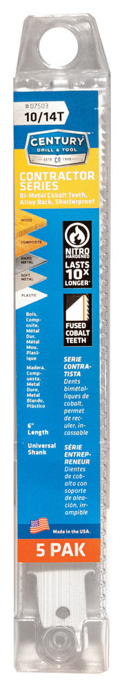 Reciprocating Saw Blade Contractor Series Cobalt Bi-Metal 10/14T X 6" 5 Pack. Width 3/4", Thickness 0.035". Application: Ferrous/Non-Ferrous Metals, Nail Embedded Wood, Composite And Plastic.