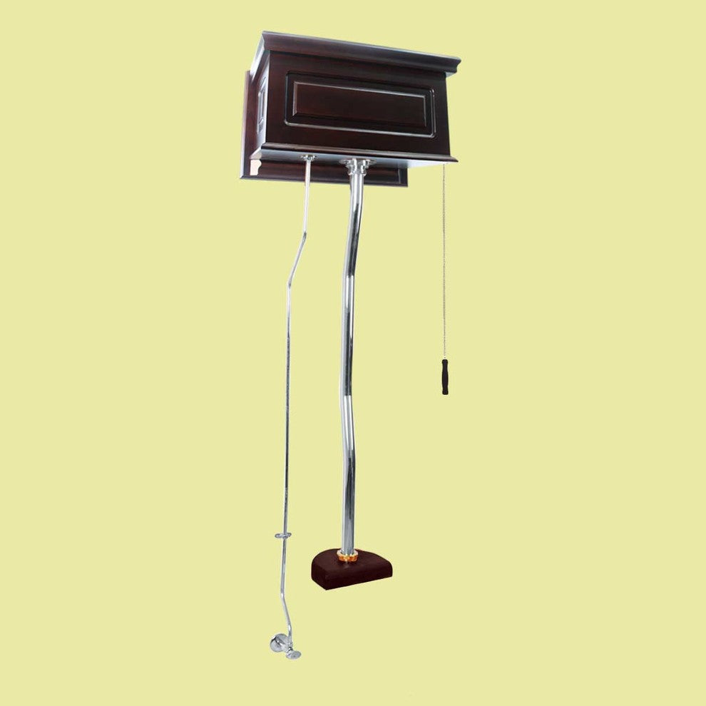 Item 20126 DARK OAK STAINED HARDWOOD HIGH TANK WITH TOP ENTRY VICTORIAN PULL CHAIN TOILET KITHigh tank toilets are great for their efficient, gravity-driven flush, ease of use and unique, eye-catching design. Transform your toilet to an Antique Victorian piece using this toilet conversion kit. This Raised Vintage toilet high tank fits flat against the wall for convenient installation. Includes installation instructions, visit our website for any additional information. All the materials used to manufacture this toilet are of the highest quality - The one that lasts long!FEATURES- Water-saving 1.6 GPF- Antique Gravity Flush Upscale Design- SAVE up to 25000 gal. of water a year- Will require a toilet bowl with a 5 1/2" tank to bowl bolt boring- Adjustable overall height 59 in. to 74 in. and Rough-in 12 in.- Wooden Toilet seat and Toilet Bowl is sold separatelyITEMS INCLUDED- High tank of durable hardwood stained in Dark Oak Wood color- Chrome-plated Stainless Steel Z-Pipes- Plastic High Tank liner- Wood Piece and Plastic Panel- Chrome Plated Mounting hardware- Supply Line- Angle Stop100% SATISFACTION GUARANTEERenovators Supply Manufacturing stocks high tank pull chain toilet replacement parts and repair kits, so even if something goes wrong we have got you covered. These are carefully wrapped to avoid any scratches or damage in the transit process. We offer you great value products for your money and a perfect way to spend wisely.