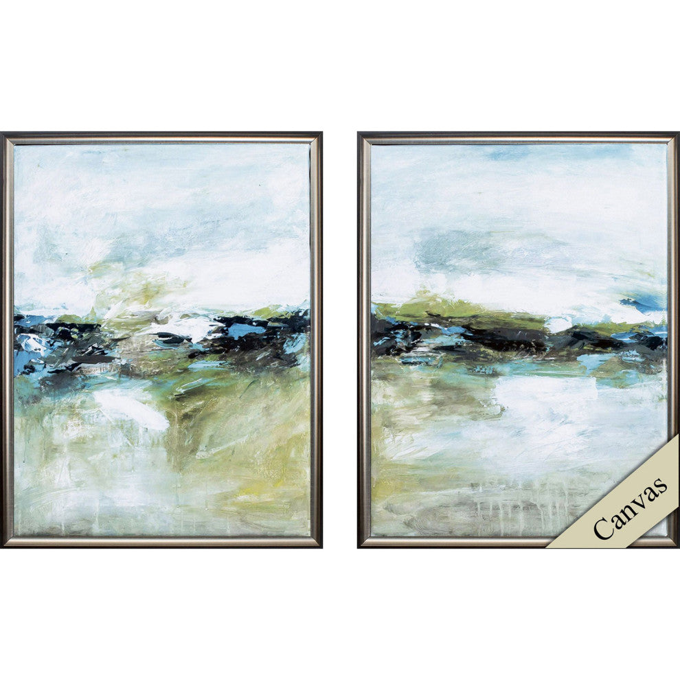 Set of two modern abstracts in blue and green on wrapped canvas. Each is finished with a contemporary silver frame.