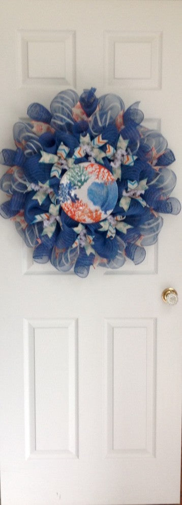 Full! New! Premium! Handmade All Season Deco Mesh Beach or Coastal Wreath. A beautiful, colorful, shatter proof, decorative plate rests on a bed of sea blue jute deco mesh. The plate is textured, like sea ripples, and is decorated with colorful coral patterns. Adorable turquoise coral printed ribbons and gray, turquoise, coral chevron ribbons surround the center. The outside wreath is made of sea blue jute deco mesh with white stripes. Blue flutes and orange coral ribbons surround the outside of the wreath. The size 24 inch diameter and 6 inches deep. See photo for size comparison.